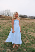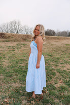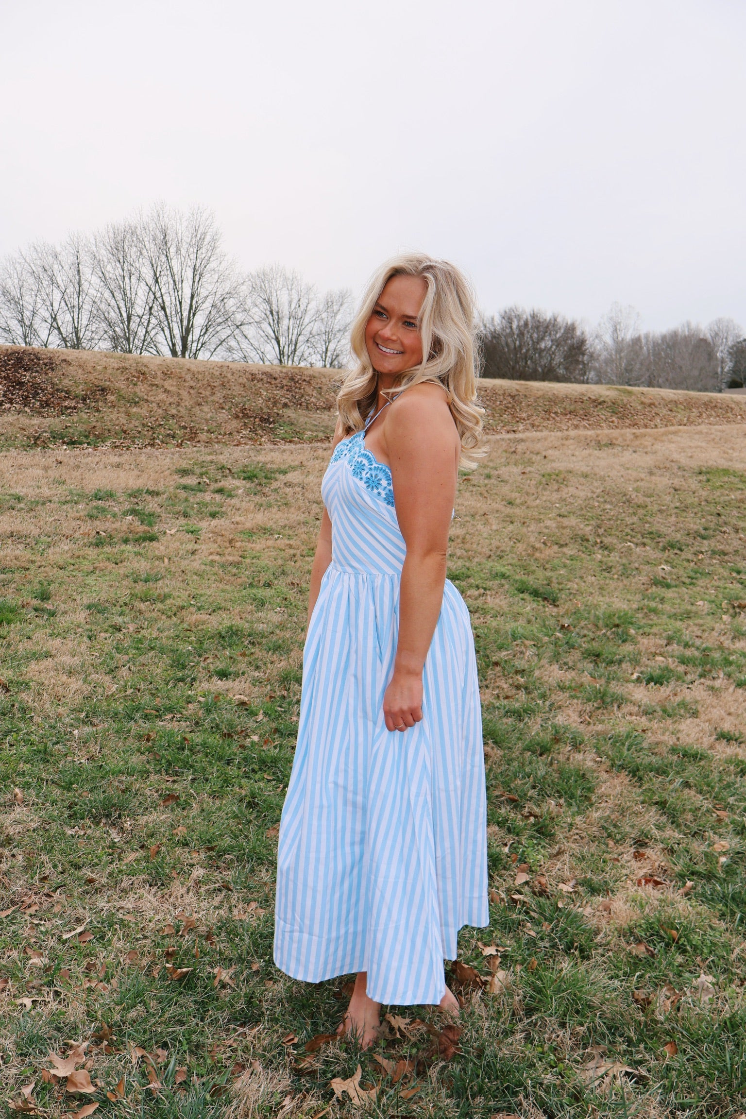 The details in this maxi! Absolutely stunning! The dress has a zipper up the back and an adjustable tie around the neck!