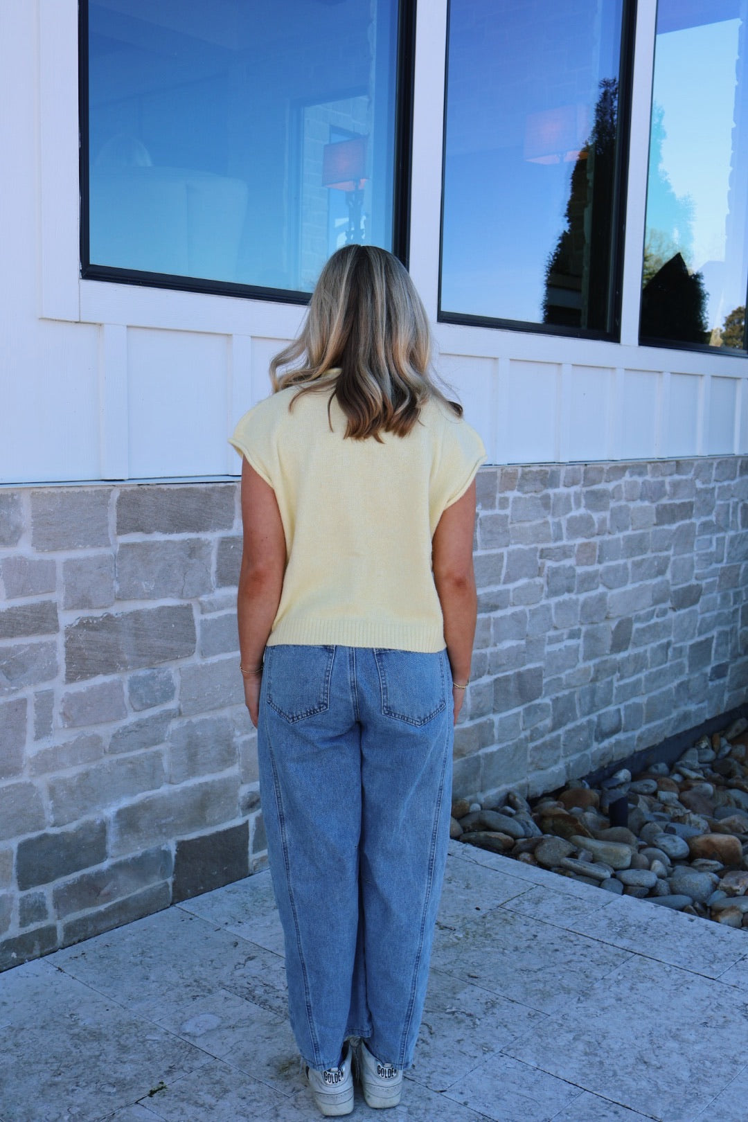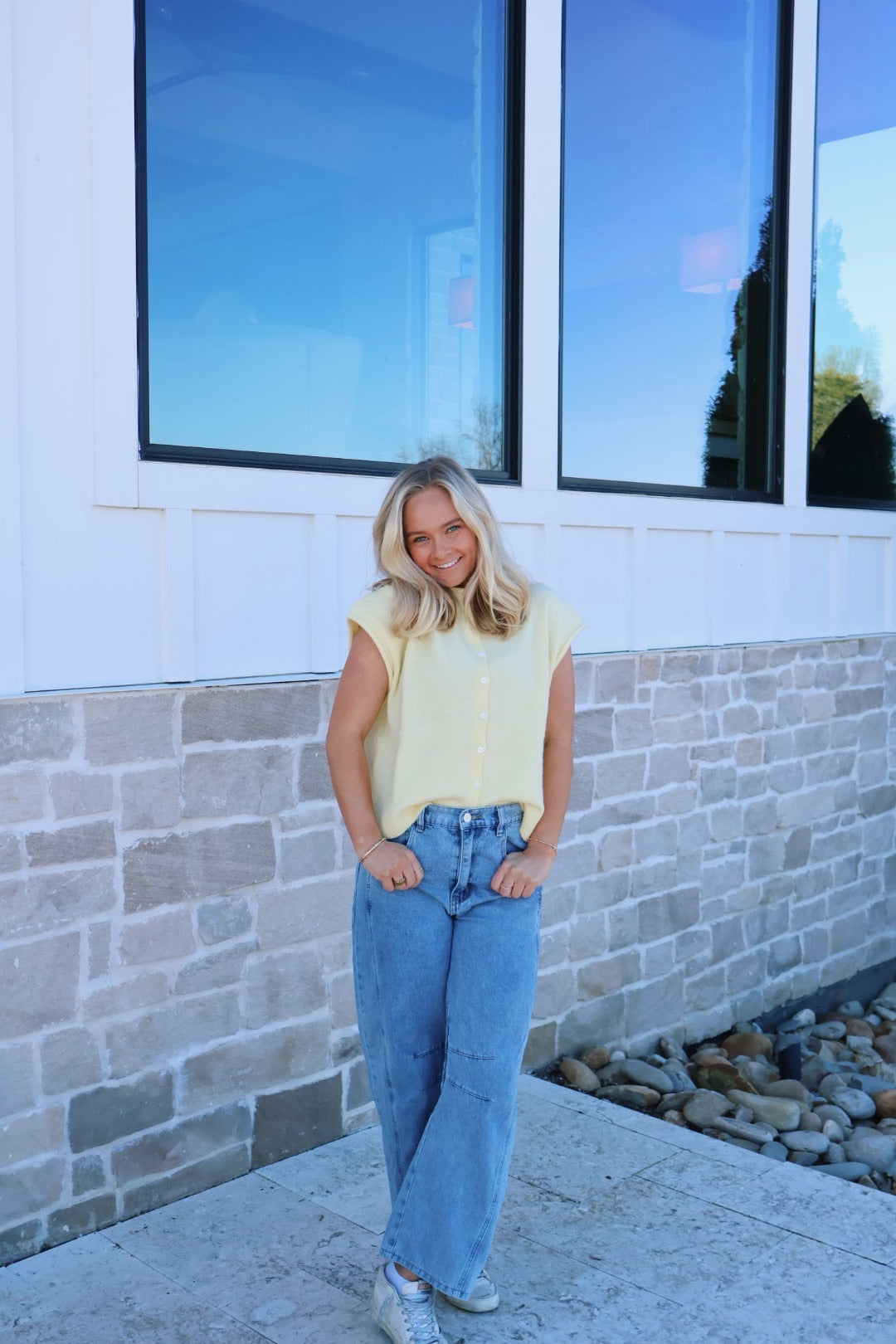 Soft sweater vest cardigan with rolled edge details, in the most beautiful butter yellow color! Buttons go up the front of the vest! The softest top ever!