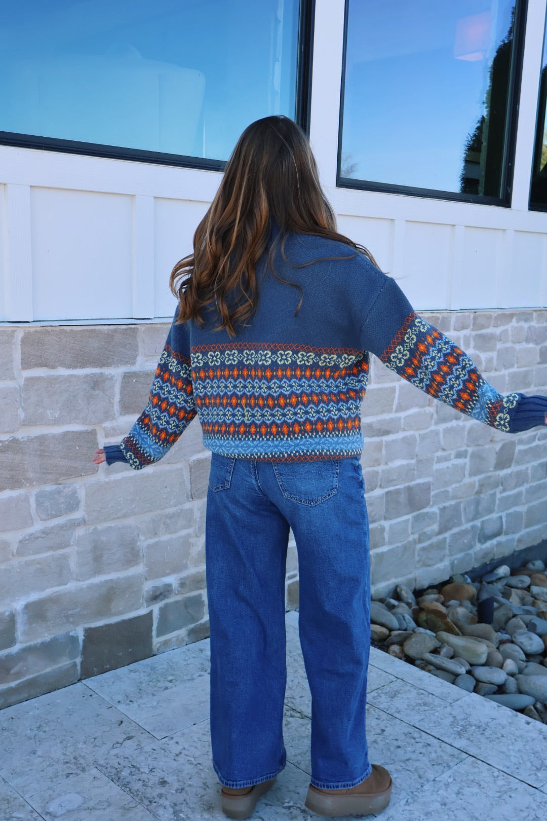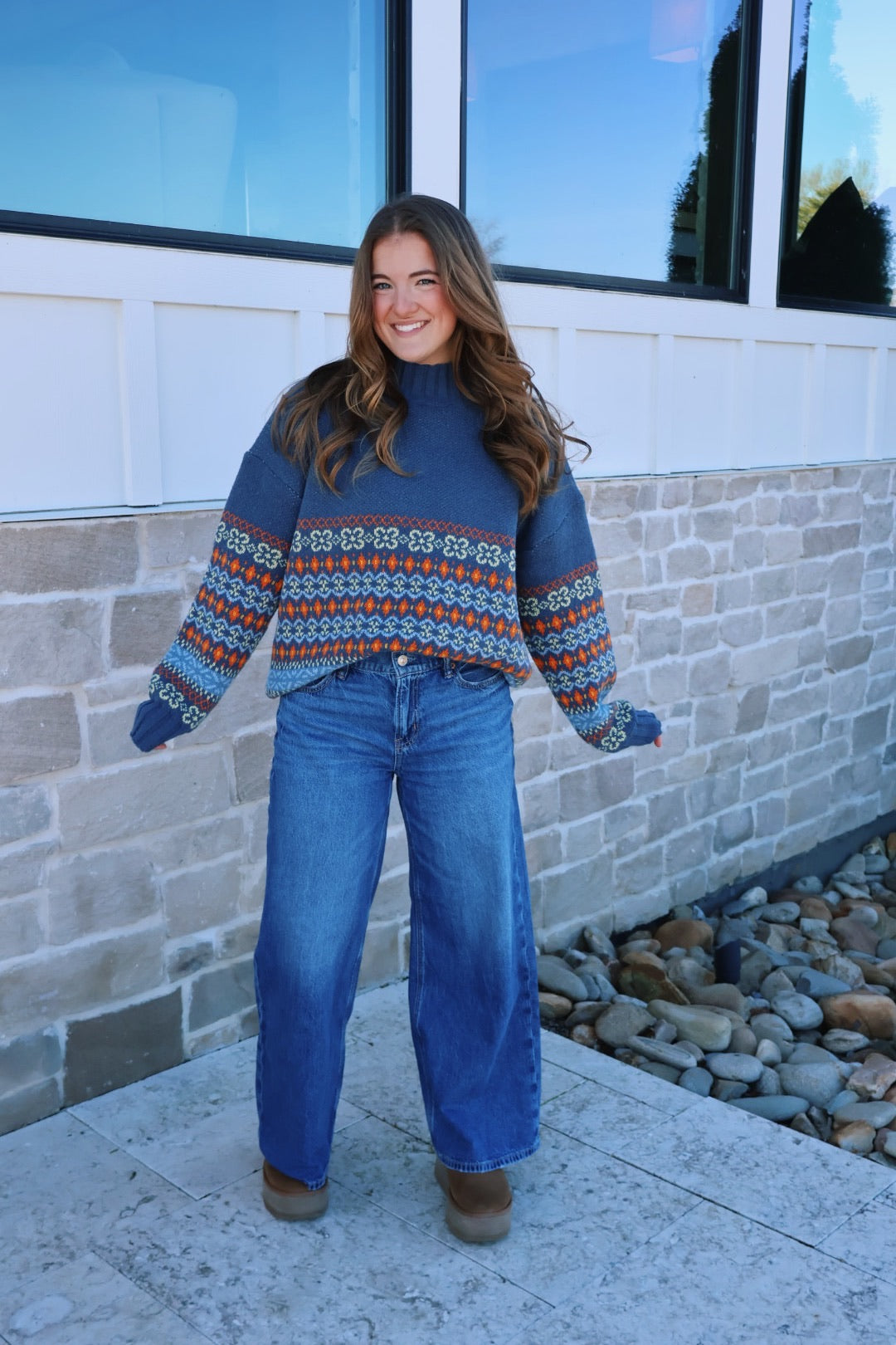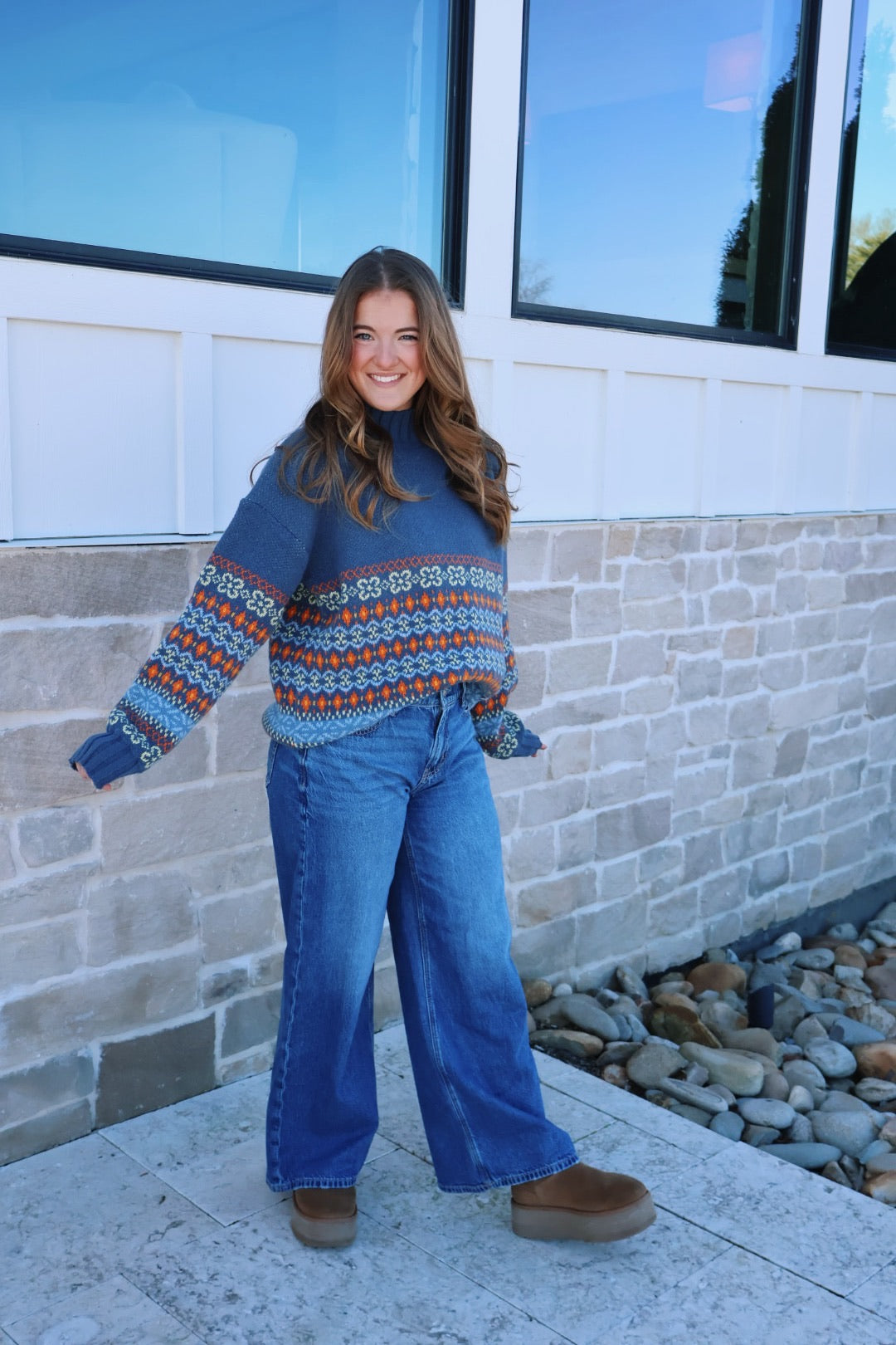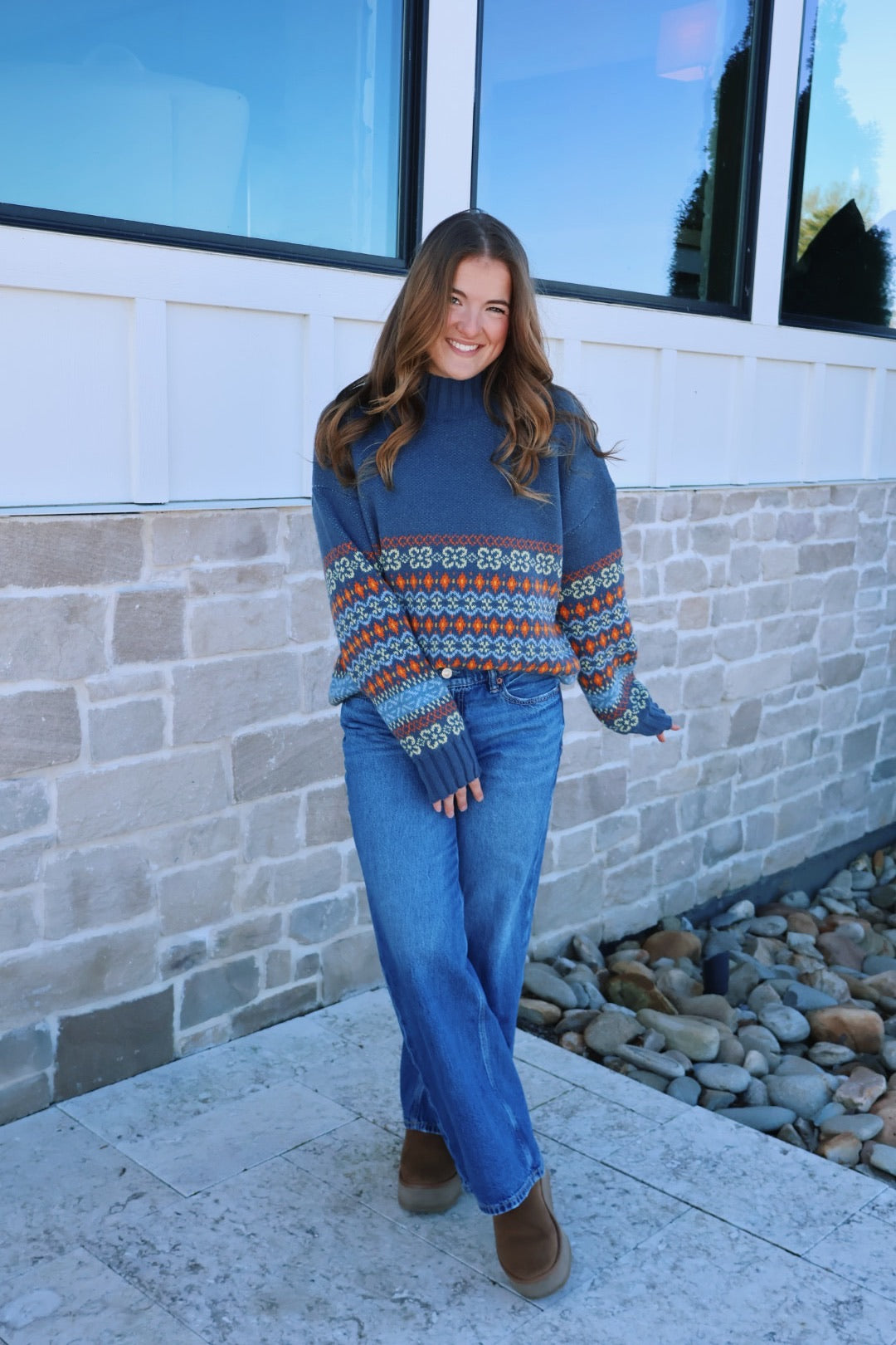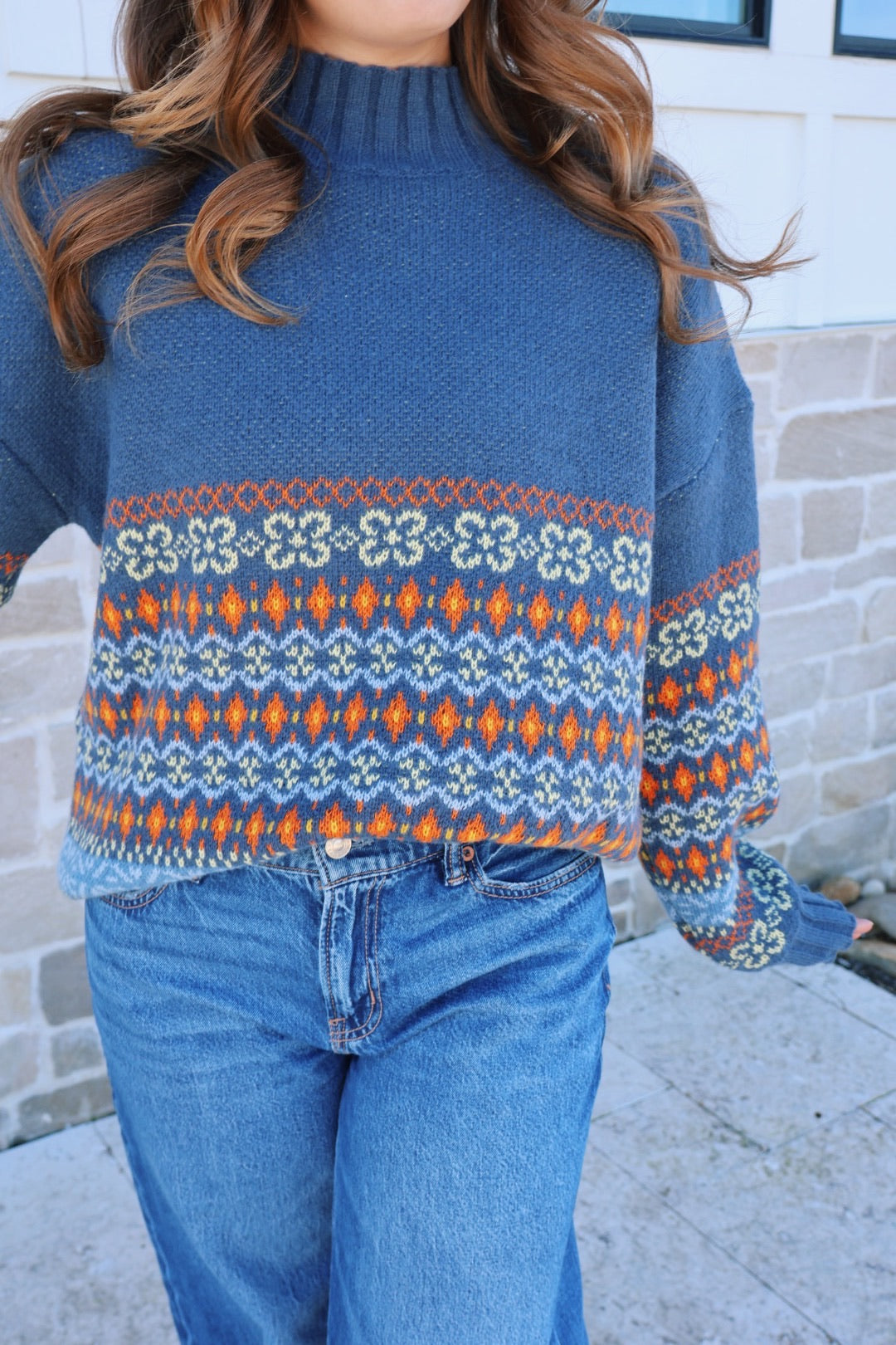 Our multicolor mockneck sweater is the perfect staple sweater! The material of this sweater is so soft and cozy, and the colors add such good detail!