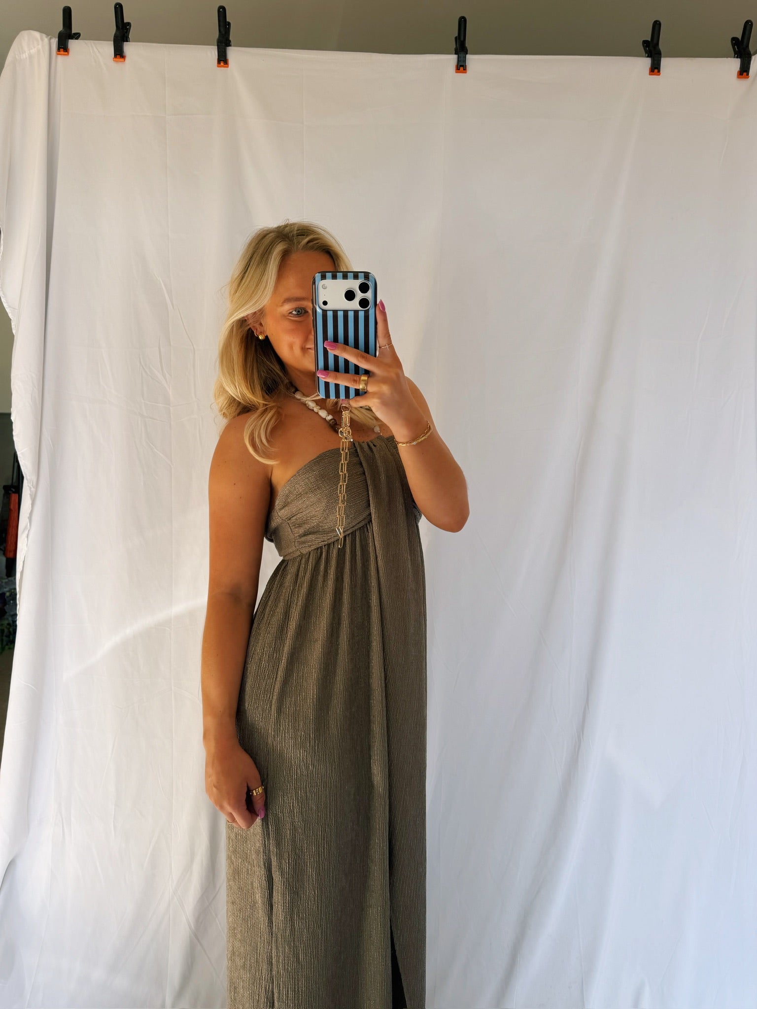 Ya'll! This is hands down one of my fav dresses! The neckline is so unique and stunning! The dress is so comfortable and lightweight! There is a little slit in the front middle!