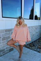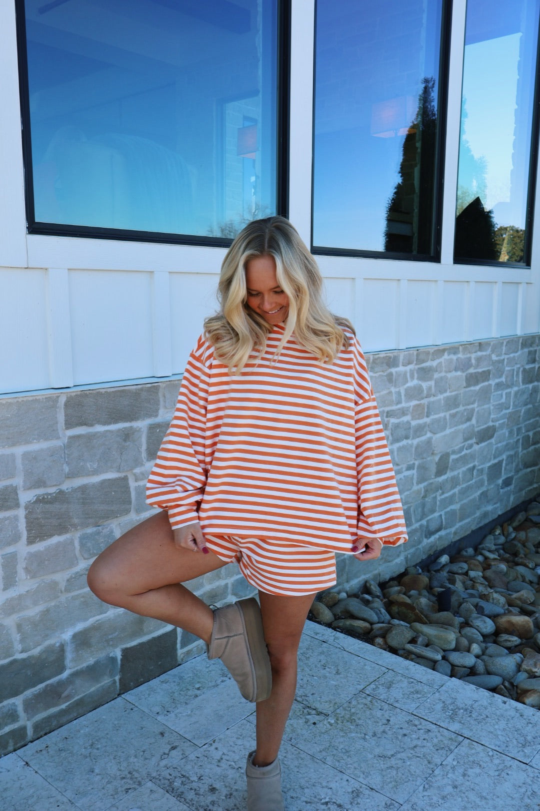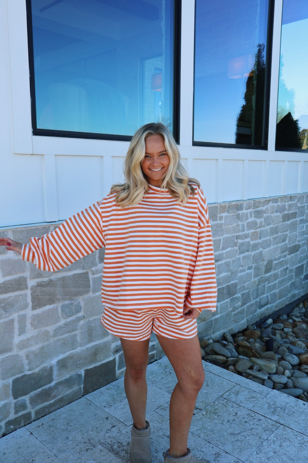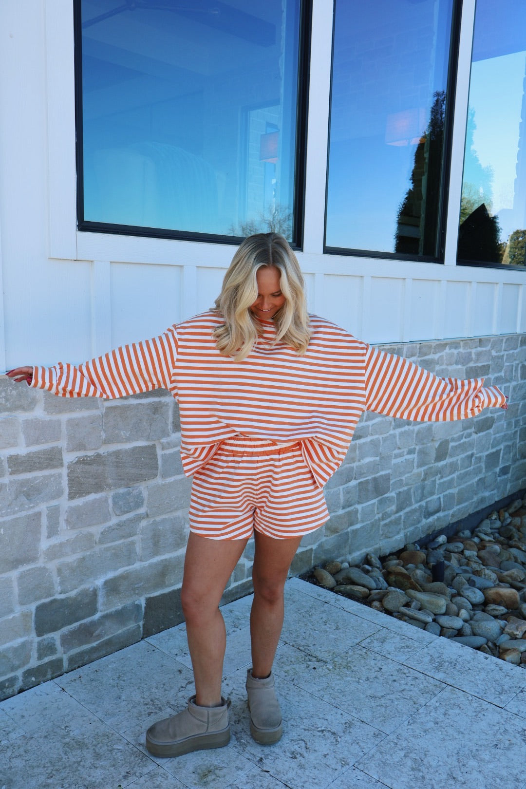 Our orange and white stripe cozy set! The fit of this set is perfect! We are in love with the orange and white! This is sold as a set! Shorts have pockets!