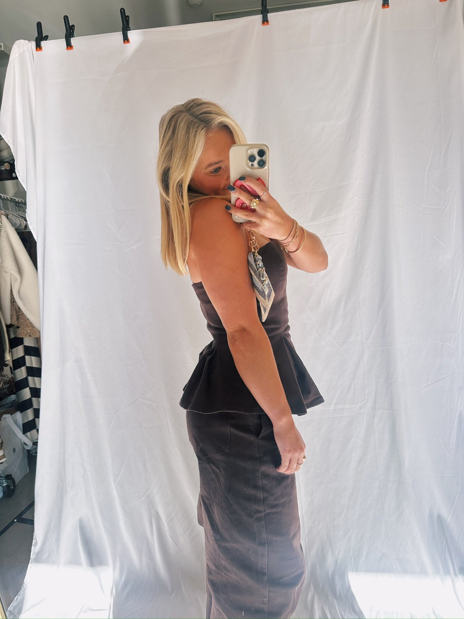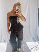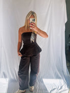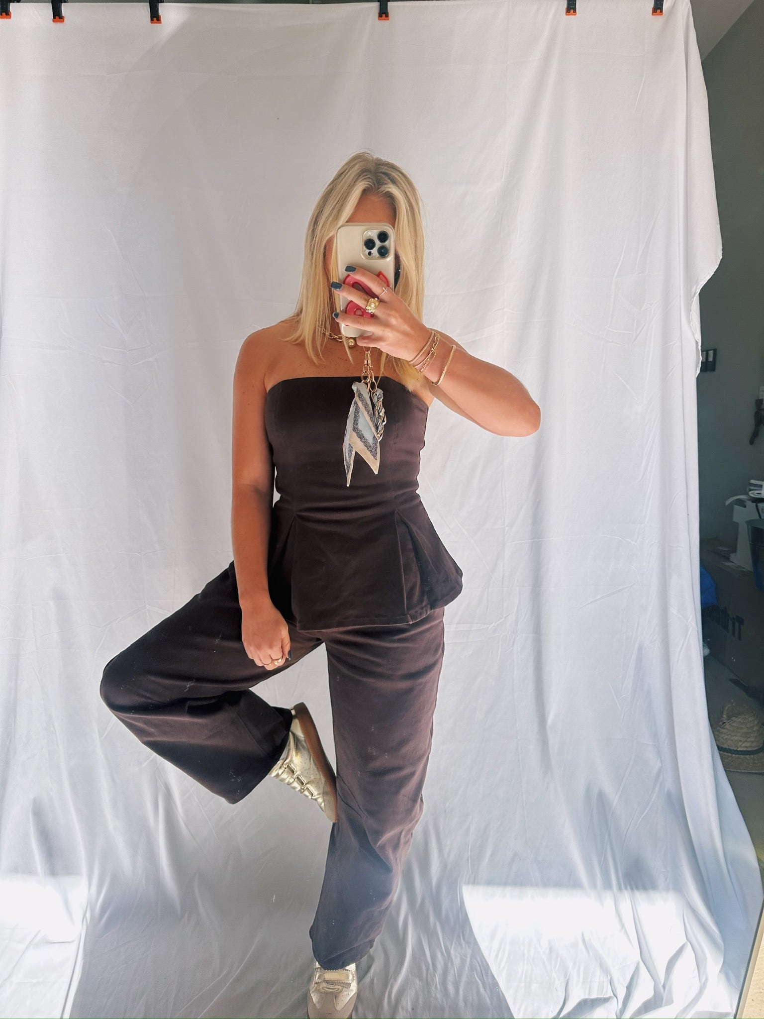 A super trendy set! You will love these brown barrel jeans and strapless pleated top. Fit true to size. Also perfect to wear separately!