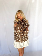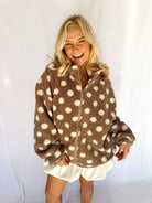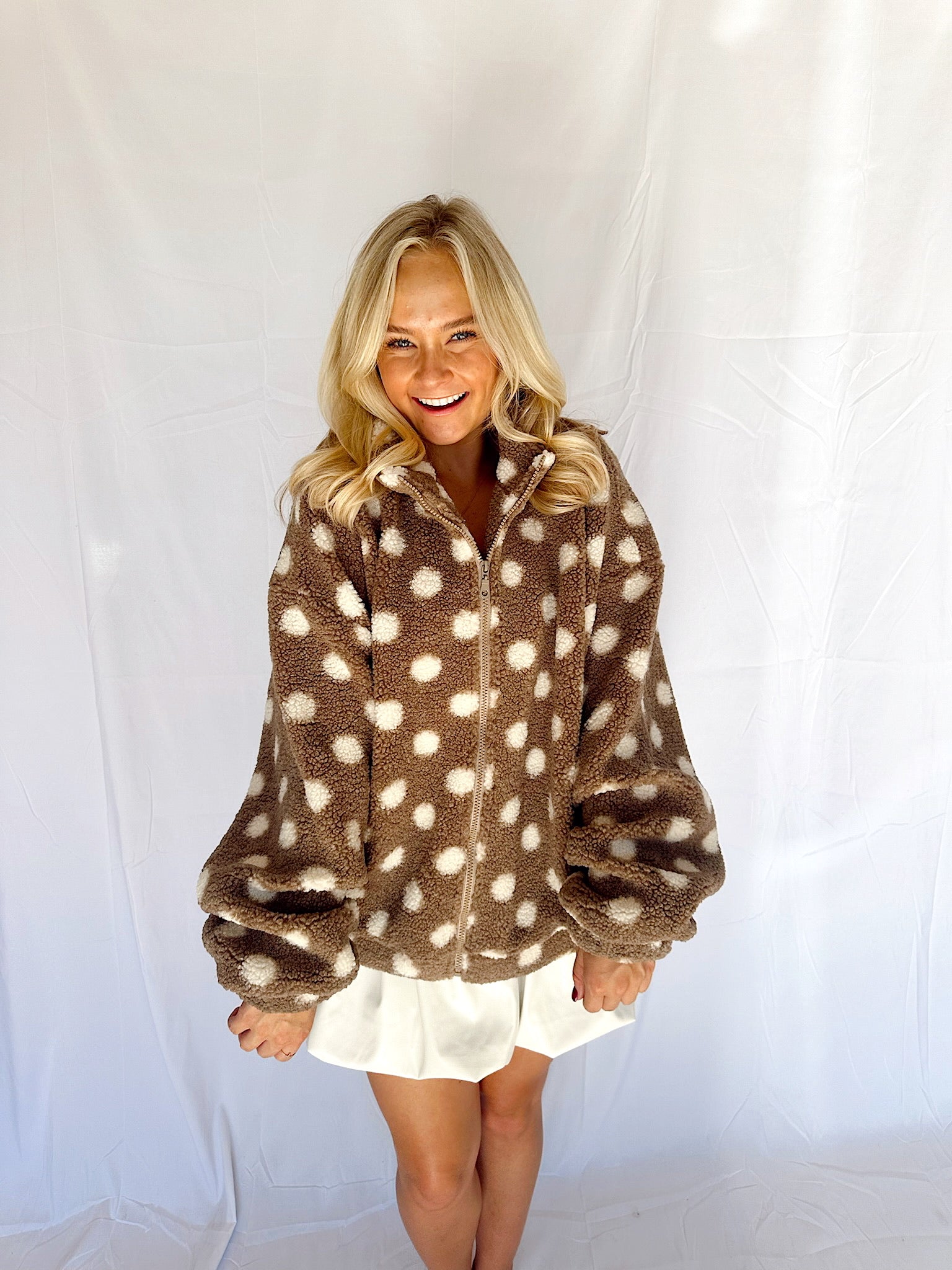 Our polka dot zip up is perfect for you! Oversized and some comfortable! Would be perfect for a chilly fall day!