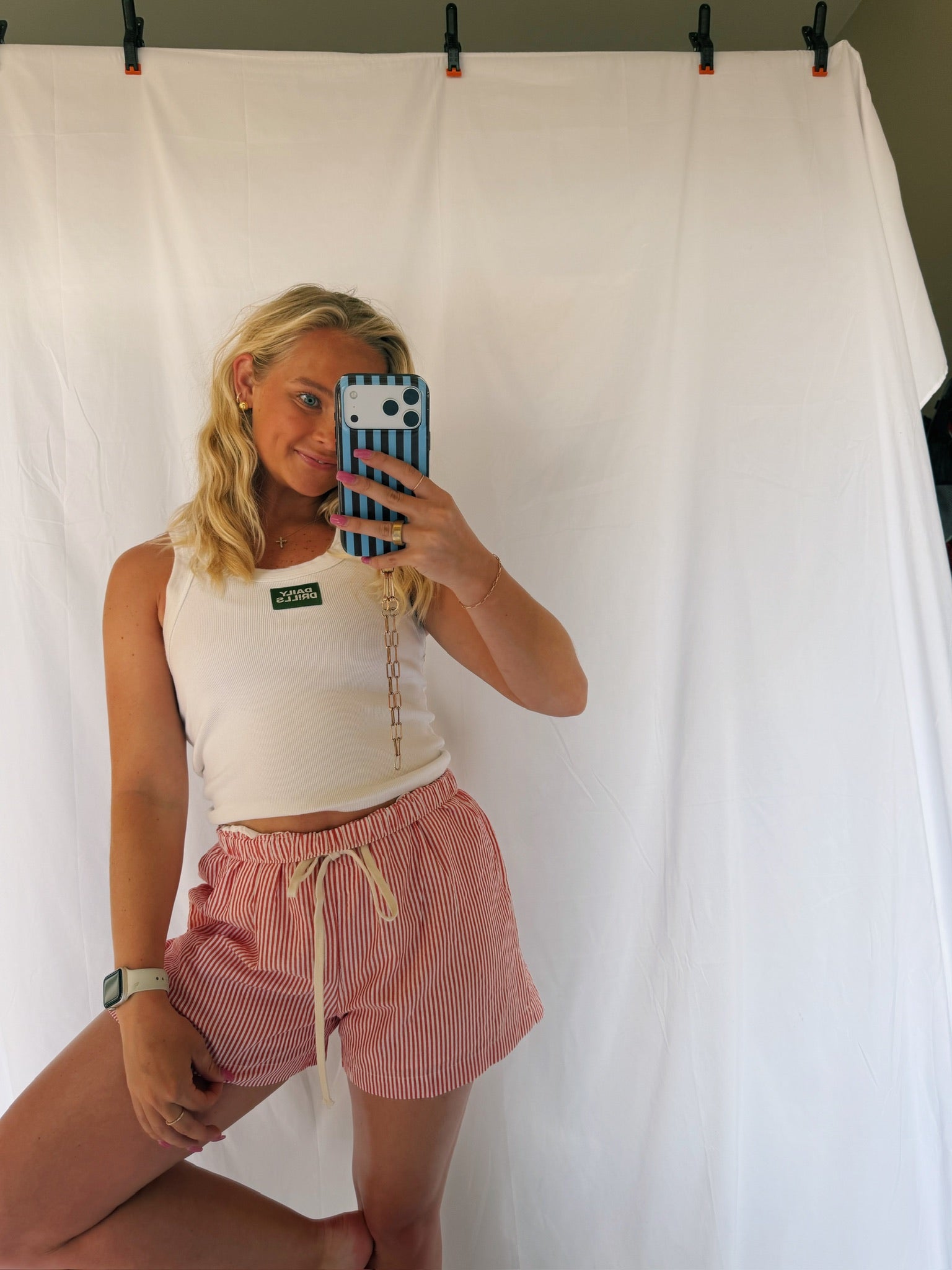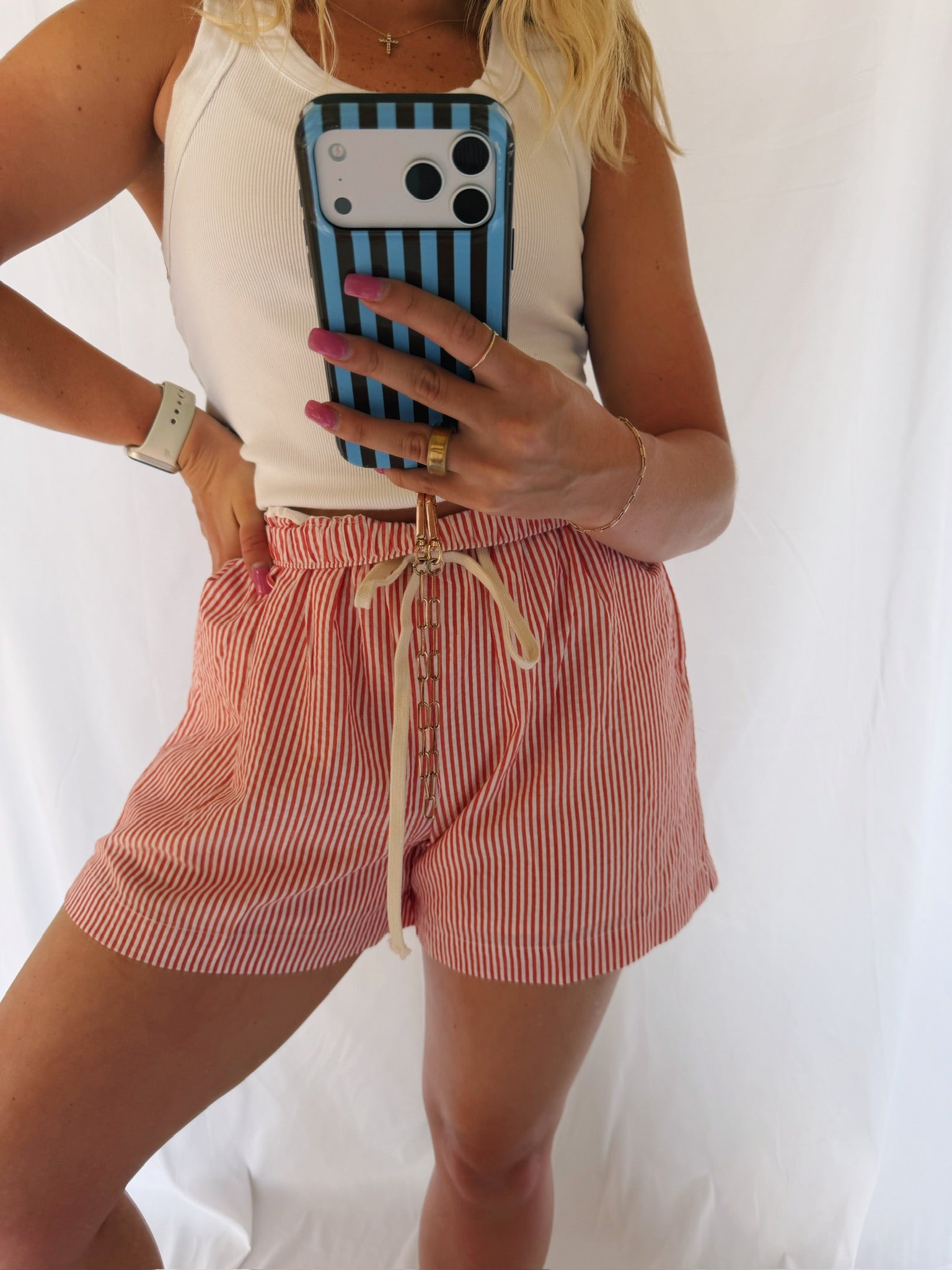 These little shorts! So lightweight and comfortable! Perfect for the summer season! The waist is stretchy and also has a tie around. Model rolled the waist!