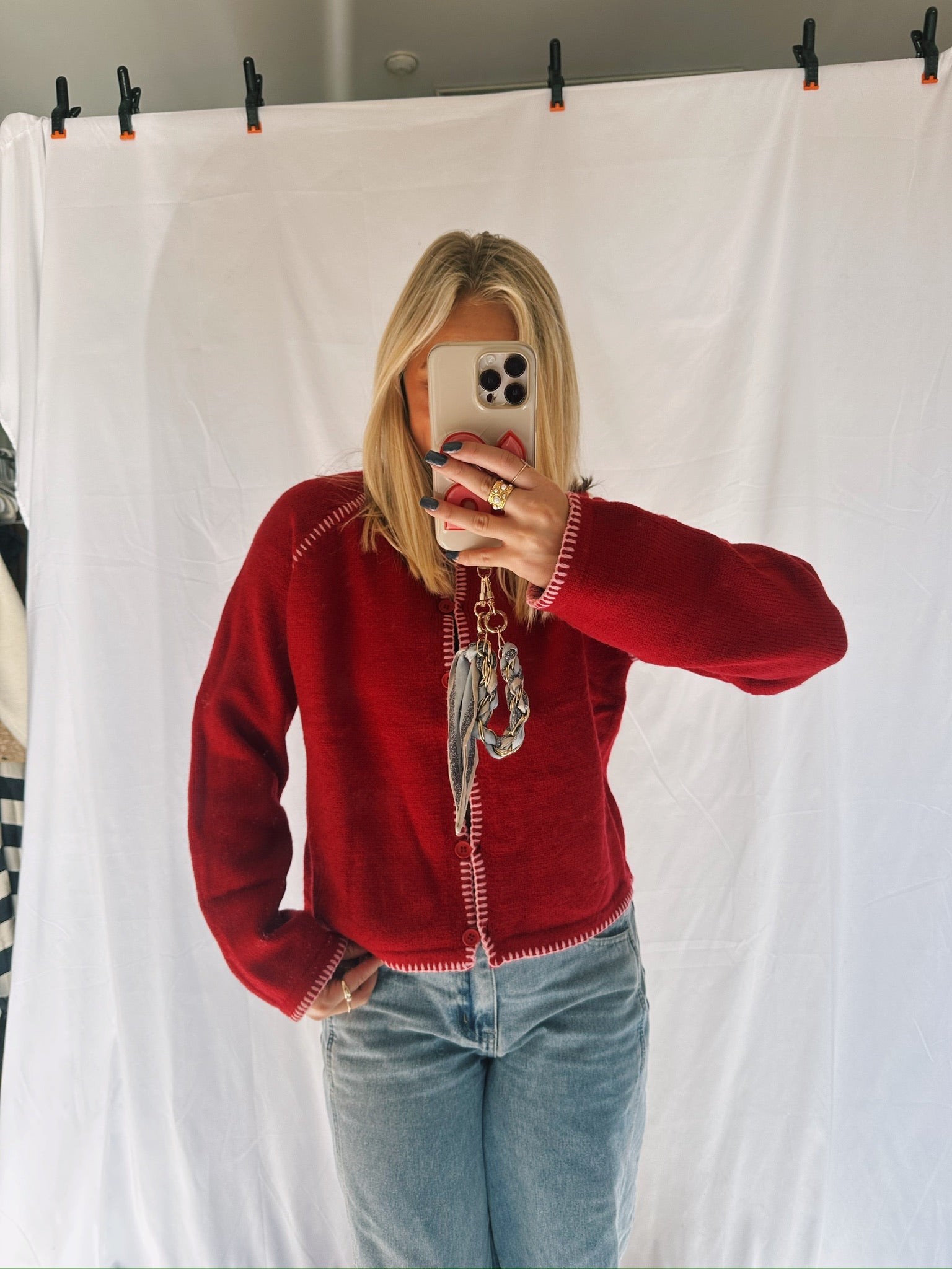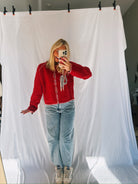 Looking for the perfect colored cardigan for the Holiday season? Look no further. Our red and pink trimmed cardigan will add the perfect pop up color during the season. Fits true to size and a nice fit.