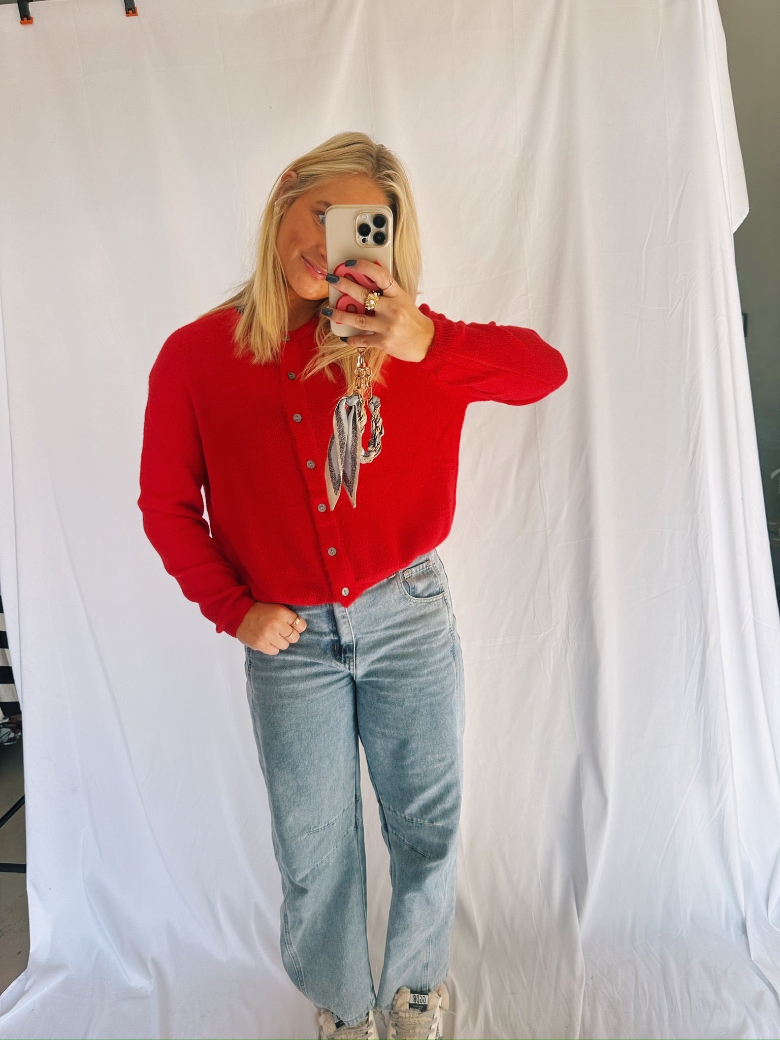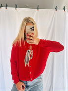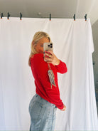 Our red simple sweater is seriously the perfect staple! The sweater can match anything, and is the softest material ever!