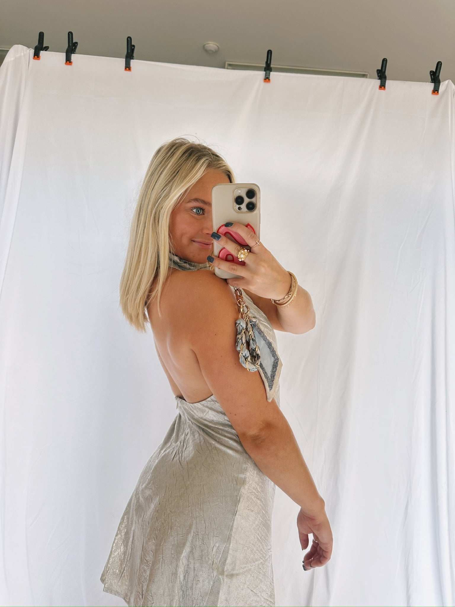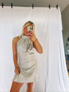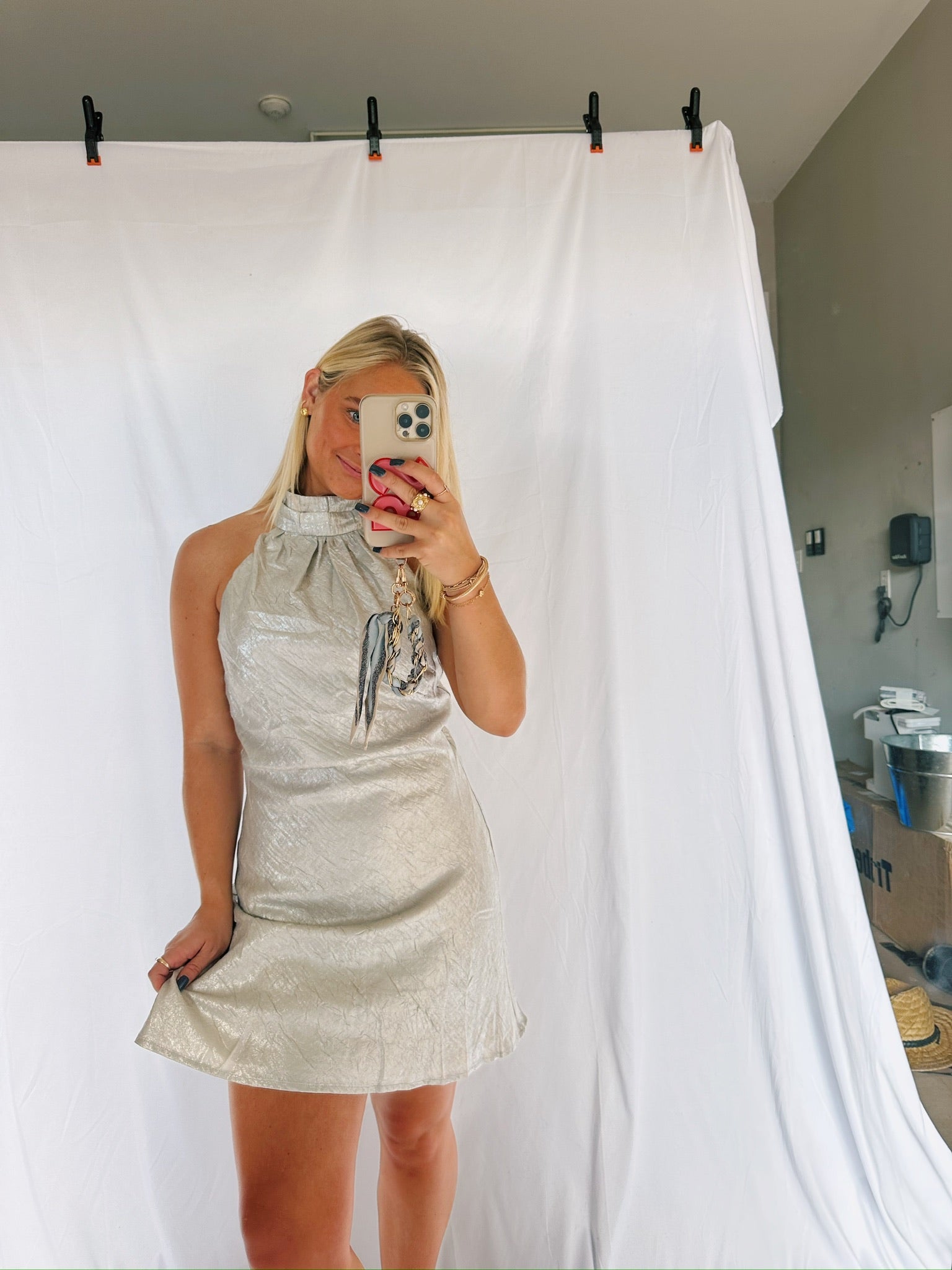 What a perfect holiday dress to add to your wardrobe! You can not go wrong with this metallic halter neck mini dress. Such a flattering fit. And what's not to love about a halter neck?!?