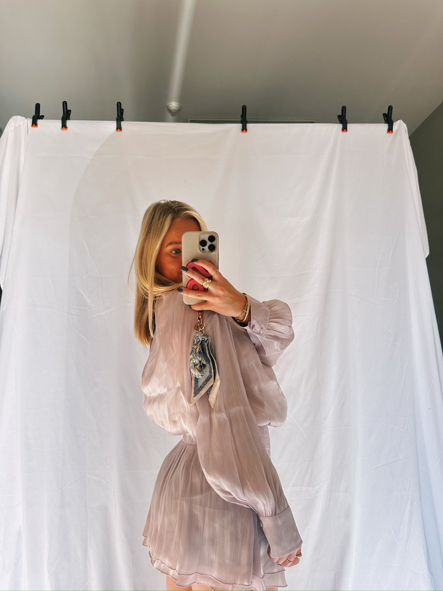 The sweetest, most perfect set. The soft pink color of this mini skirt and open back blouse is stunning. The skirt zips up the side and fits true to size. The flowy matching blouse has an open back and buttons behind the neck. A perfect addition to your wardrobe.