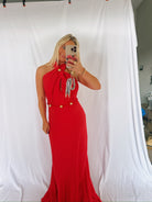 Absolutely stunning red dress! We love the detail of this one. The halter neck, gold accents and rope belt make this maxi a unique one. The color is exquisite and will be a showstopper at any Holiday party you attend this season!