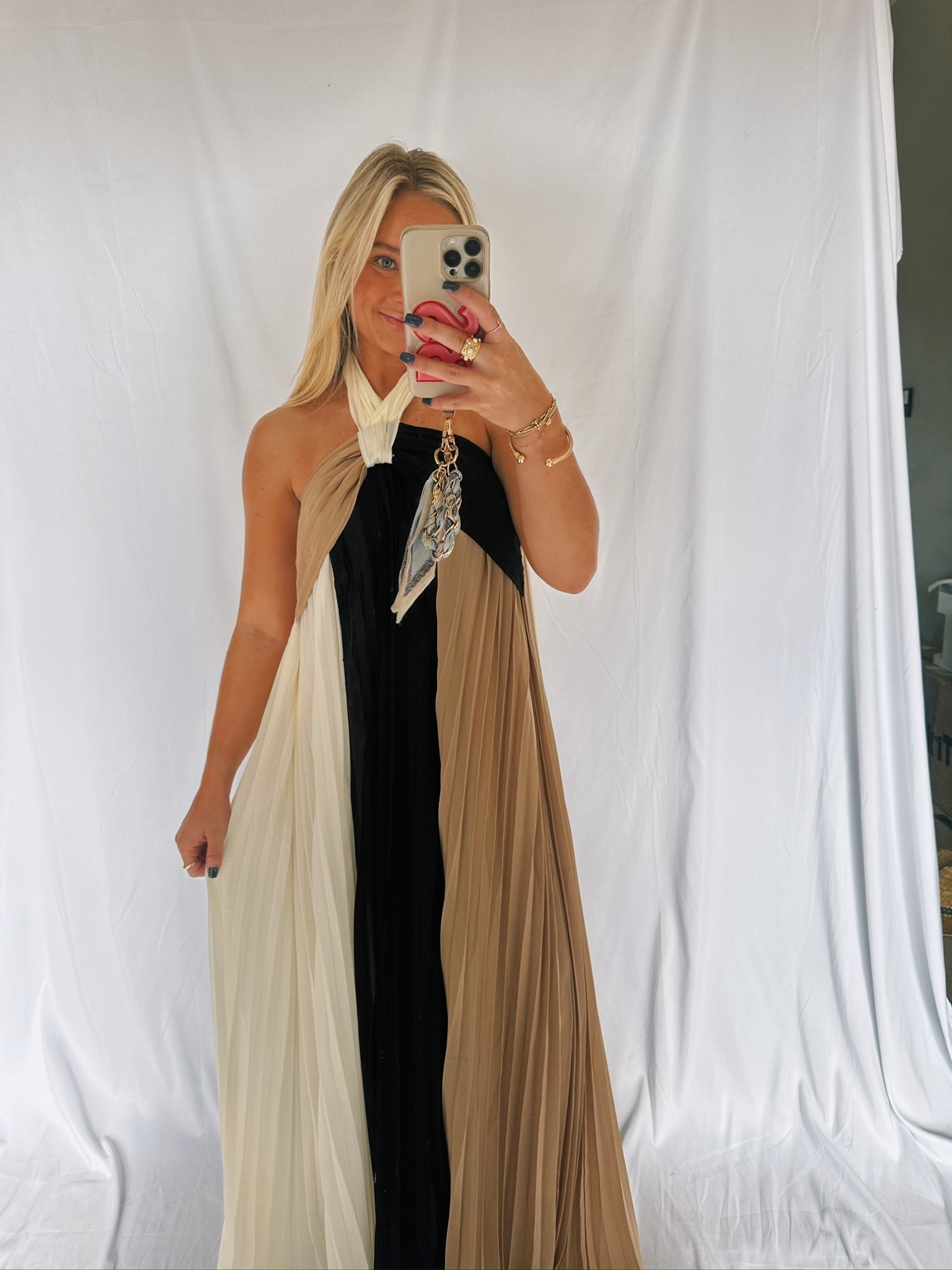 Looking for a comfy, flowy maxi dress?!? Look no further than our Three-Toned Block Maxi. Open back with halter tie neck. This dress can be worn for several occasions and can easily be dressed up or down for varying looks.