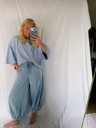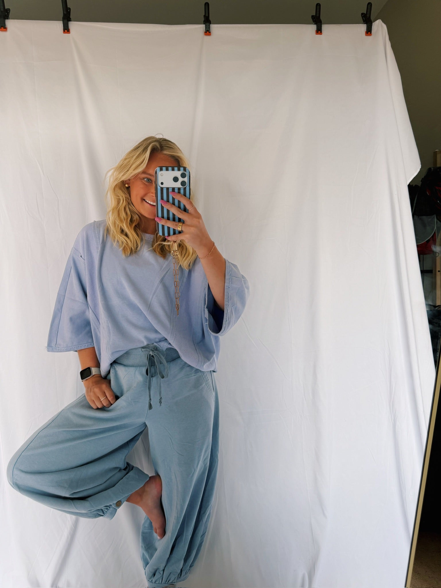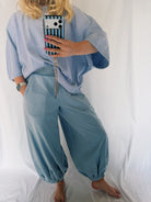 Our washed blue bubble pant! Can be styled so many ways! The pant has a tie around the waist, and the cutest gathering at the ankles! These pants are so cozy!