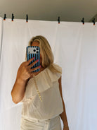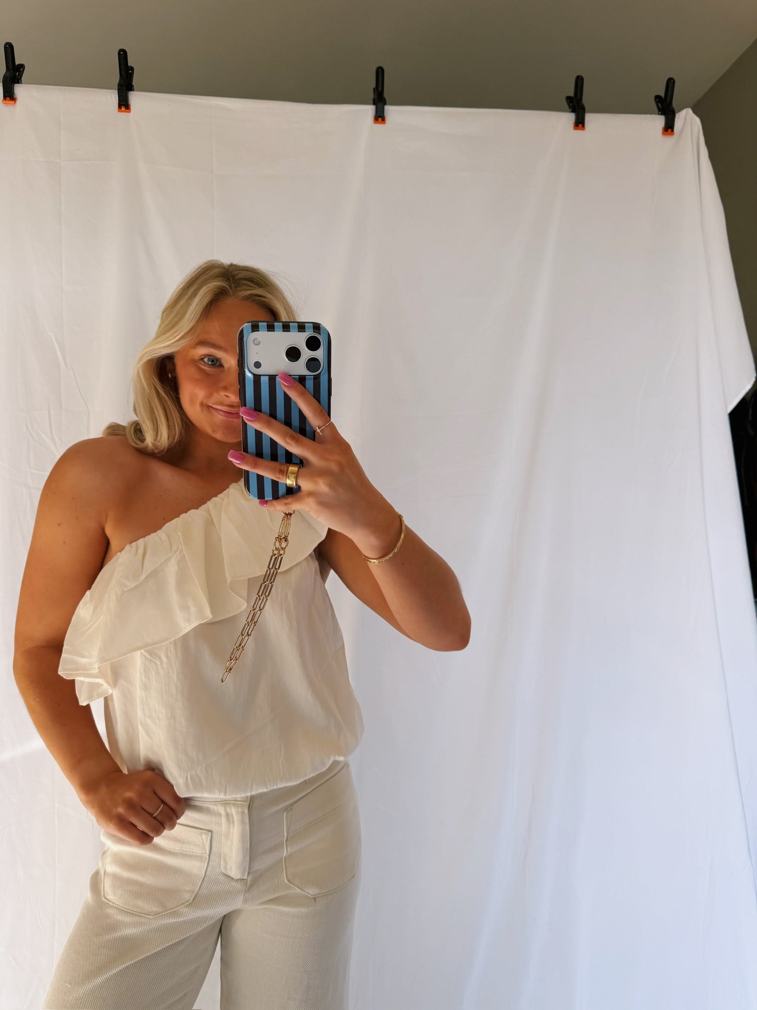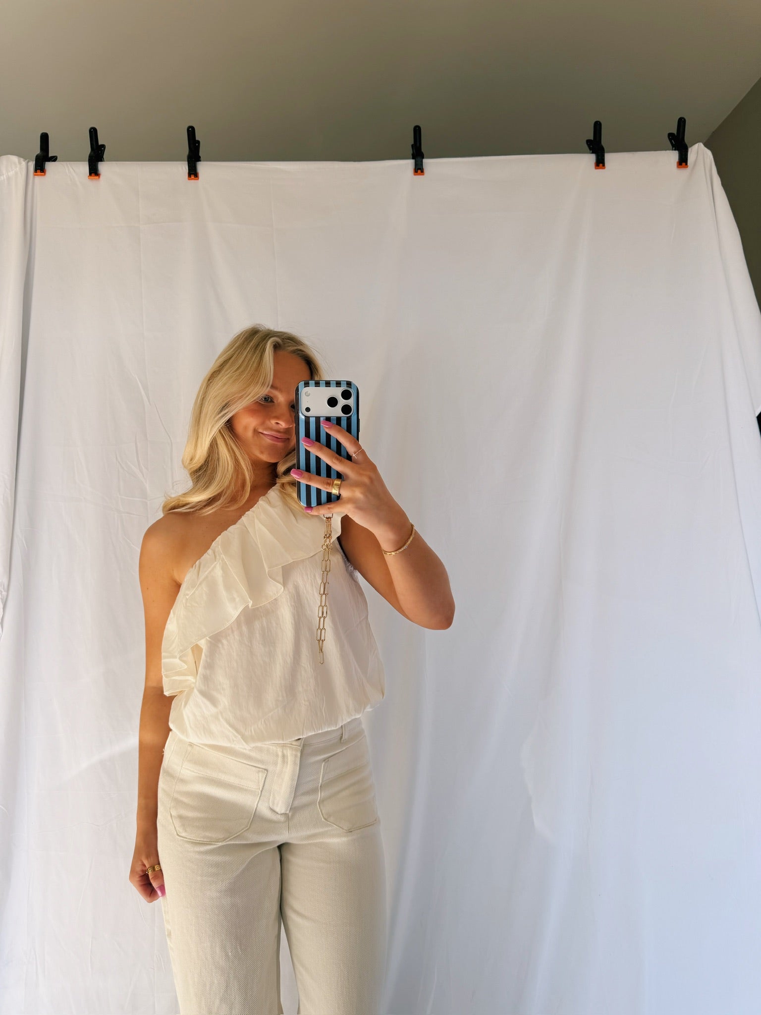 The perfect staple top! The ruffle one shoulder adds so much detail! The material is lightweight and perfect! This top is super stretchy!