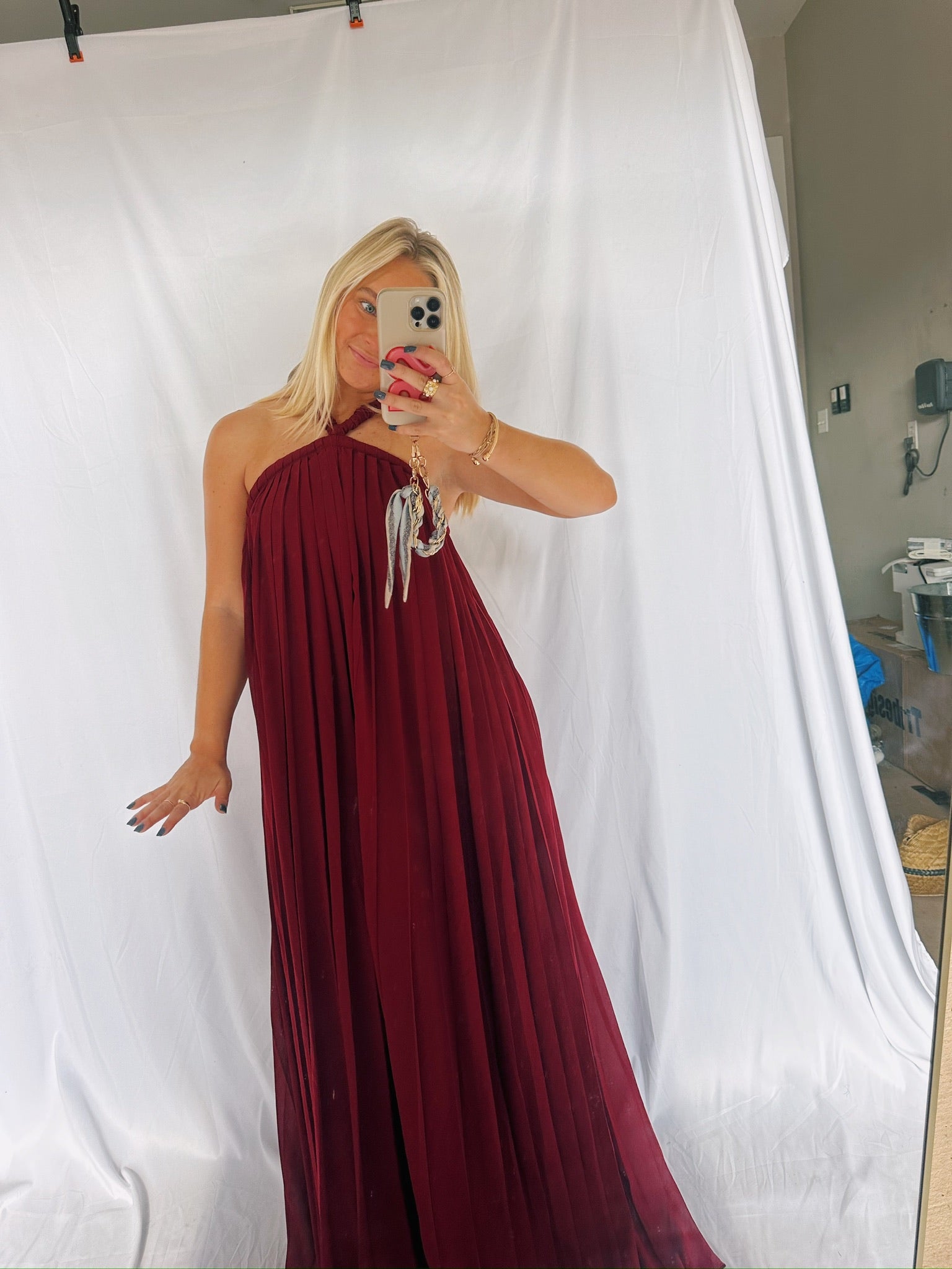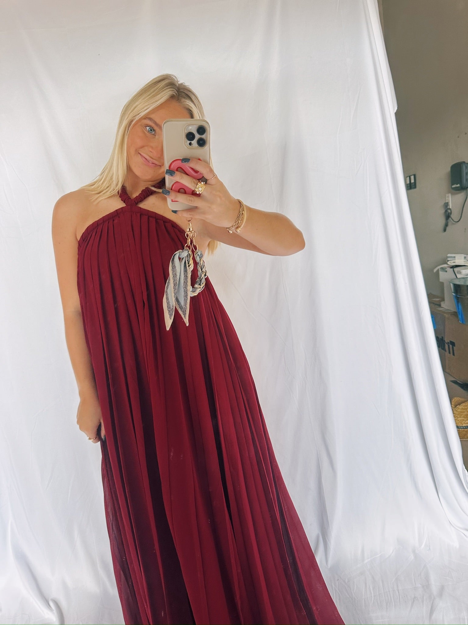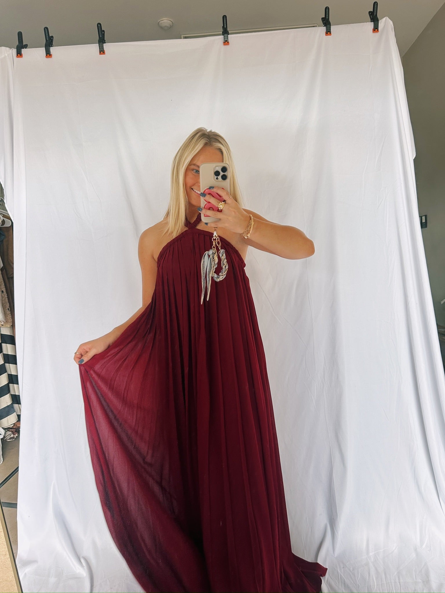 The wine color in this dress is stunning! We are obsessed with the halter neck, and the rope detail. Such a simple, but stunning dress! The tie around the neck is adjustable!