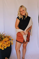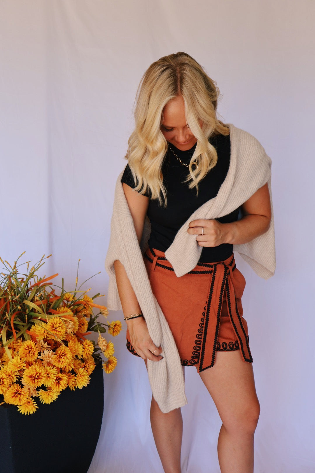 This skort! The detail in the embroidery is perfect! This skort is perfect for the fall. There is a zipper up the side and the front ties in a bow!