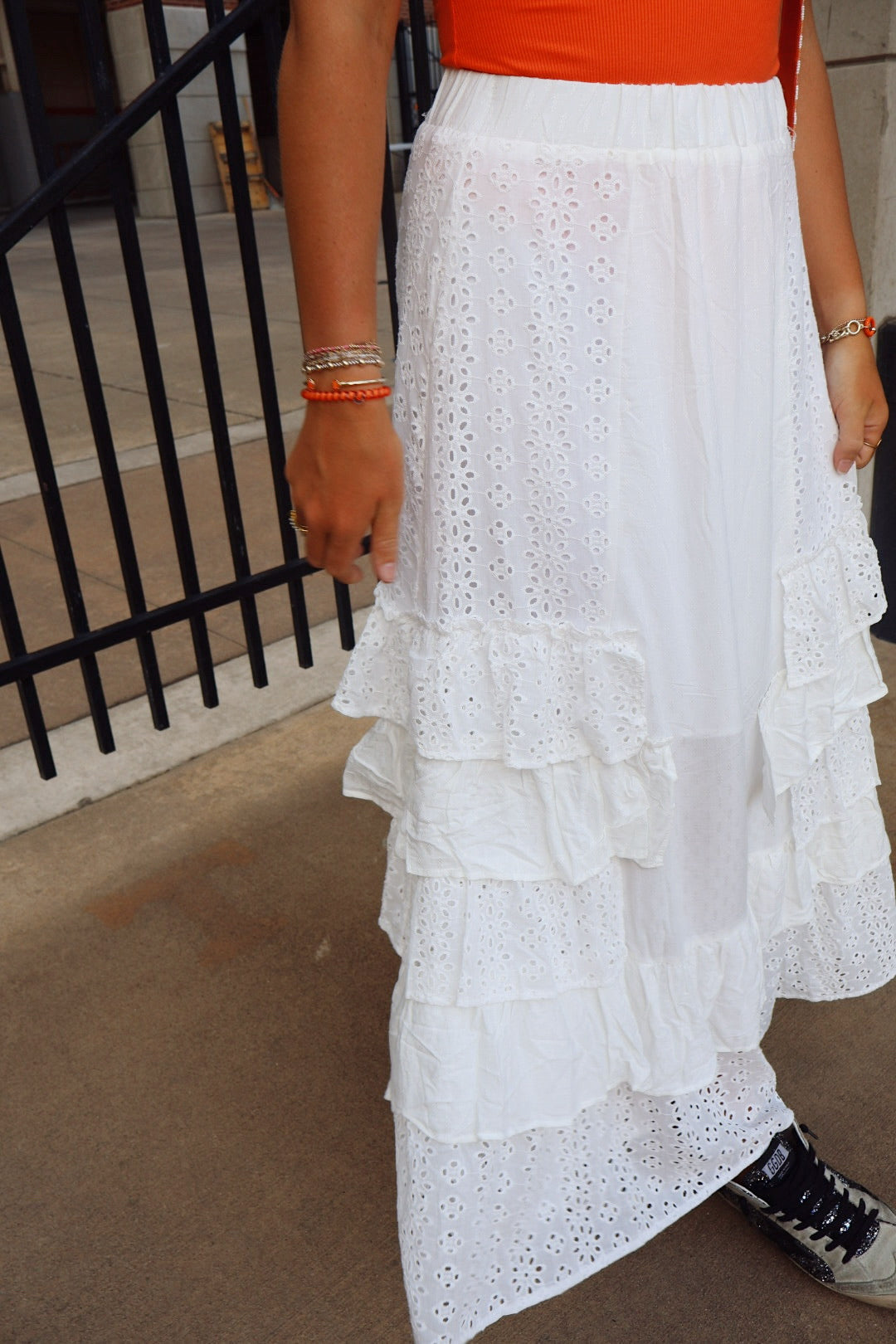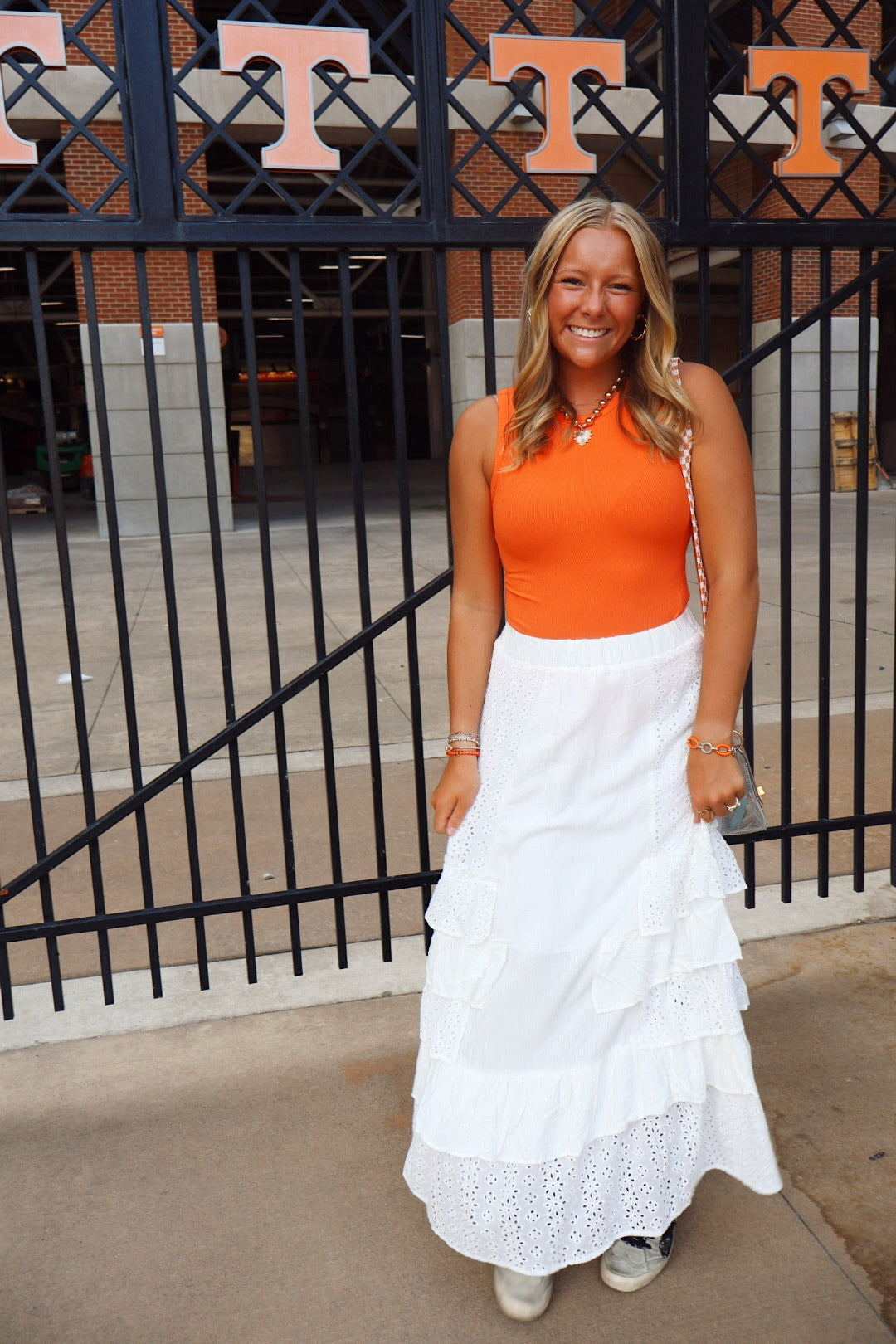 This white ruffle maxi skirt will become a staple in your closet! We love the detail of this skirt. It can be styled with many items but looks perfect with this bodysuit for gameday!