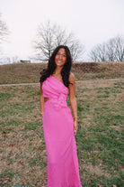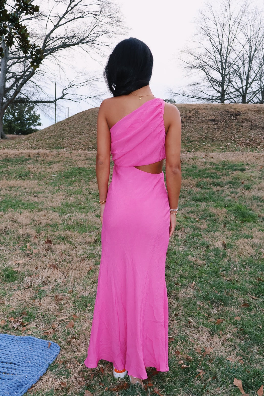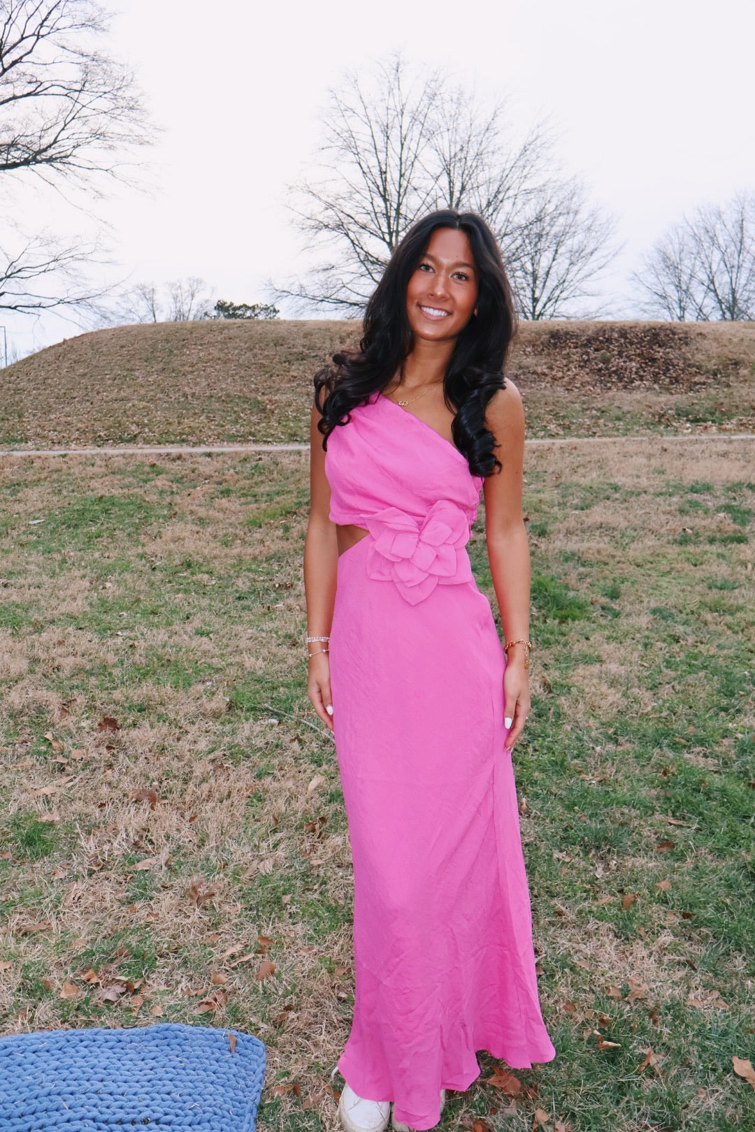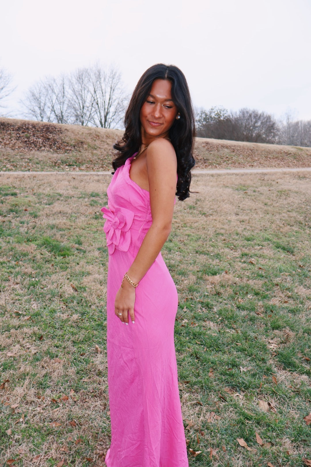 The color of this! So perfect! I am obsessed with the one shoulder and big flower detail! There is a zipper up the back of the dress!