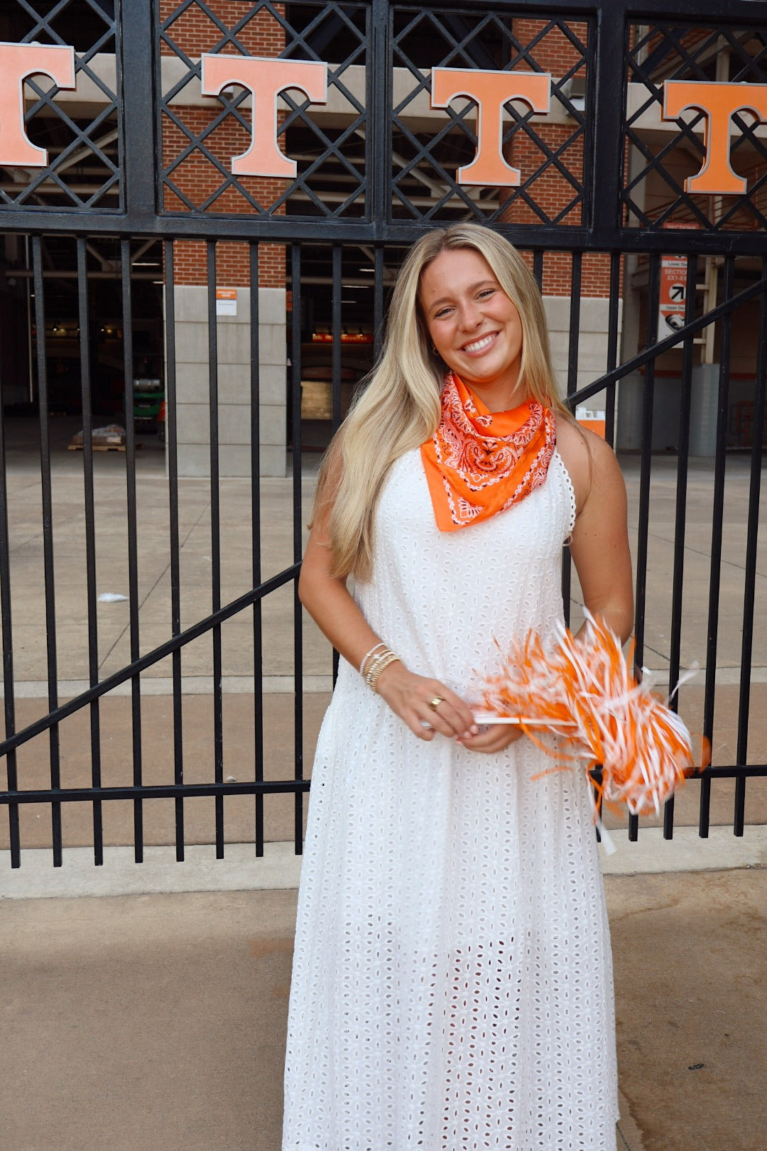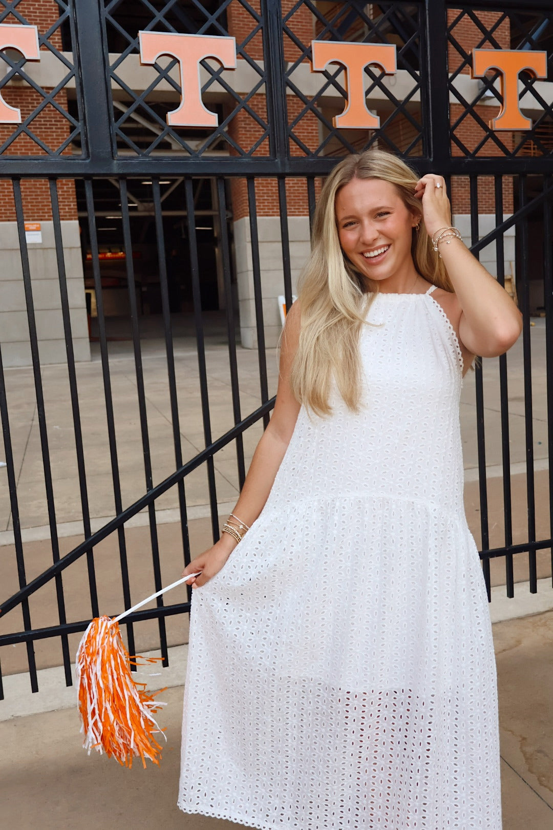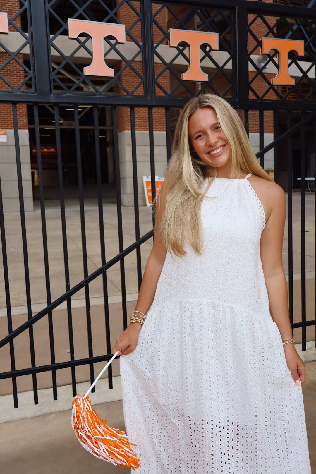 This is a perfect gameday outfit for any school! Our eyelet halter maxi dress can be coupled with any school-colored accessory for the perfect fit. Straps are tied in the back to adjust as needed.