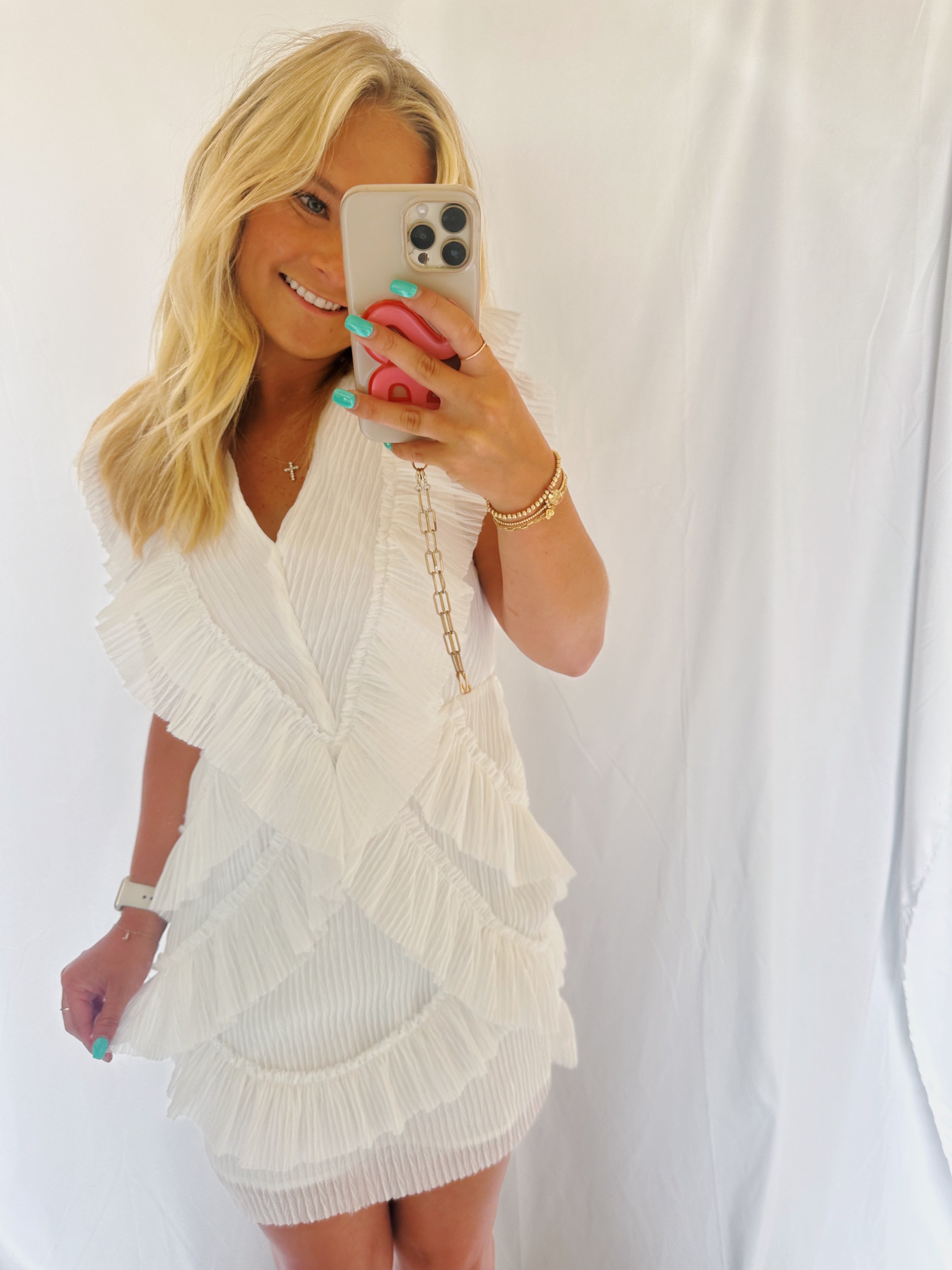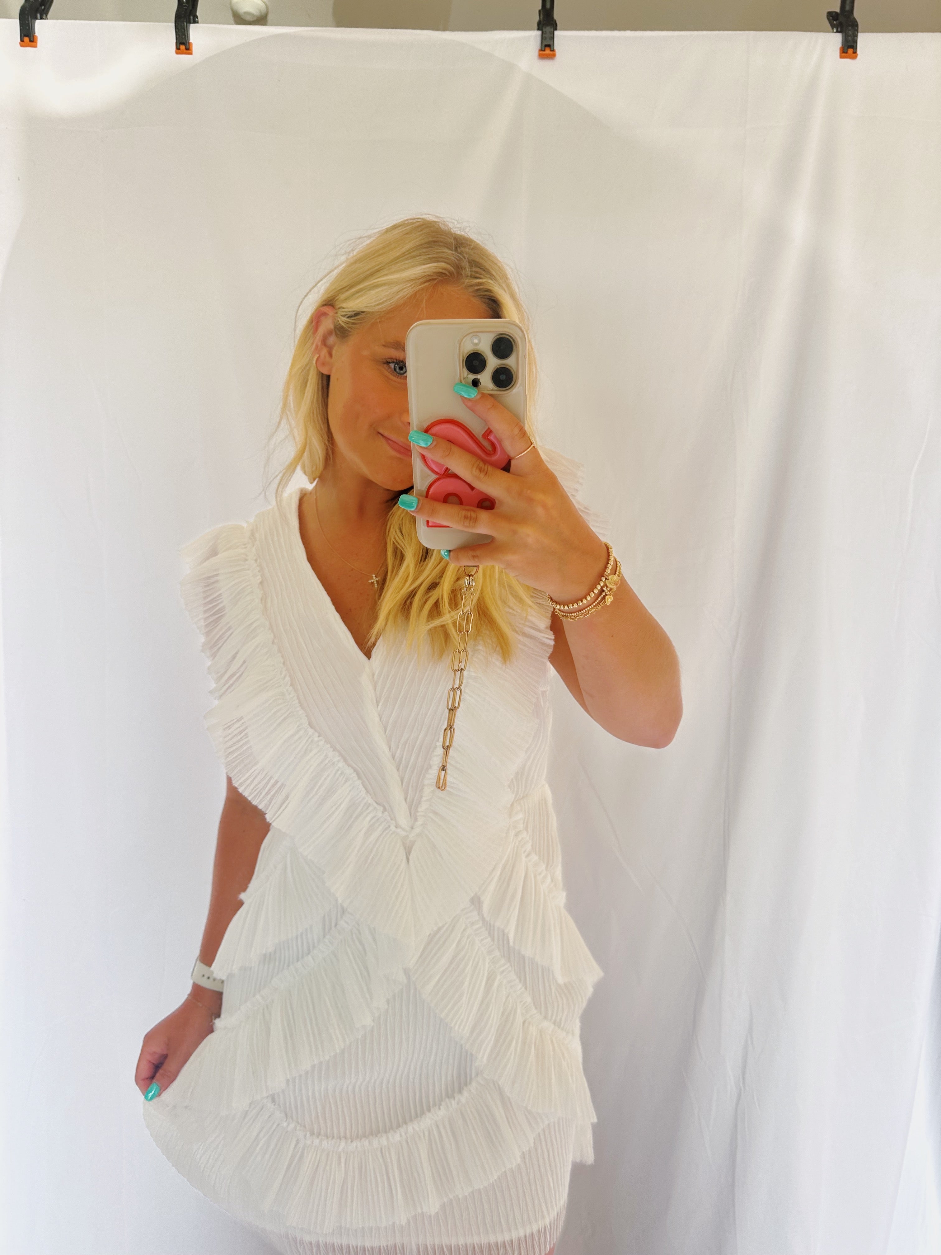 Our white ruffle mini is stunning! The ruffles are beautiful, adding so much character! The back of the dress clasps with 4 buttons on the top, and has a pretty open back look!