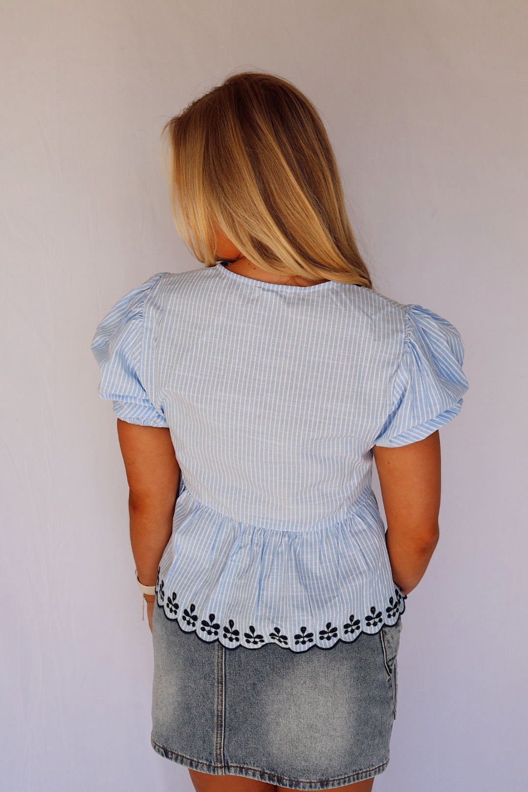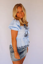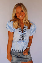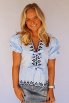 Looking for just the perfect spring top?!? Look no further! You will love our v-neck front tie blouse. Top features scallop embroidered neckline along with slight bubble sleeves.