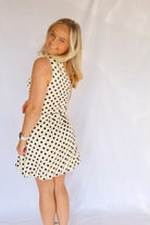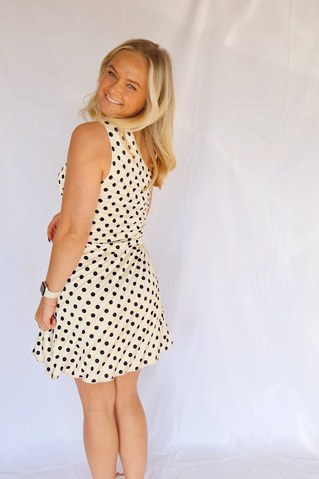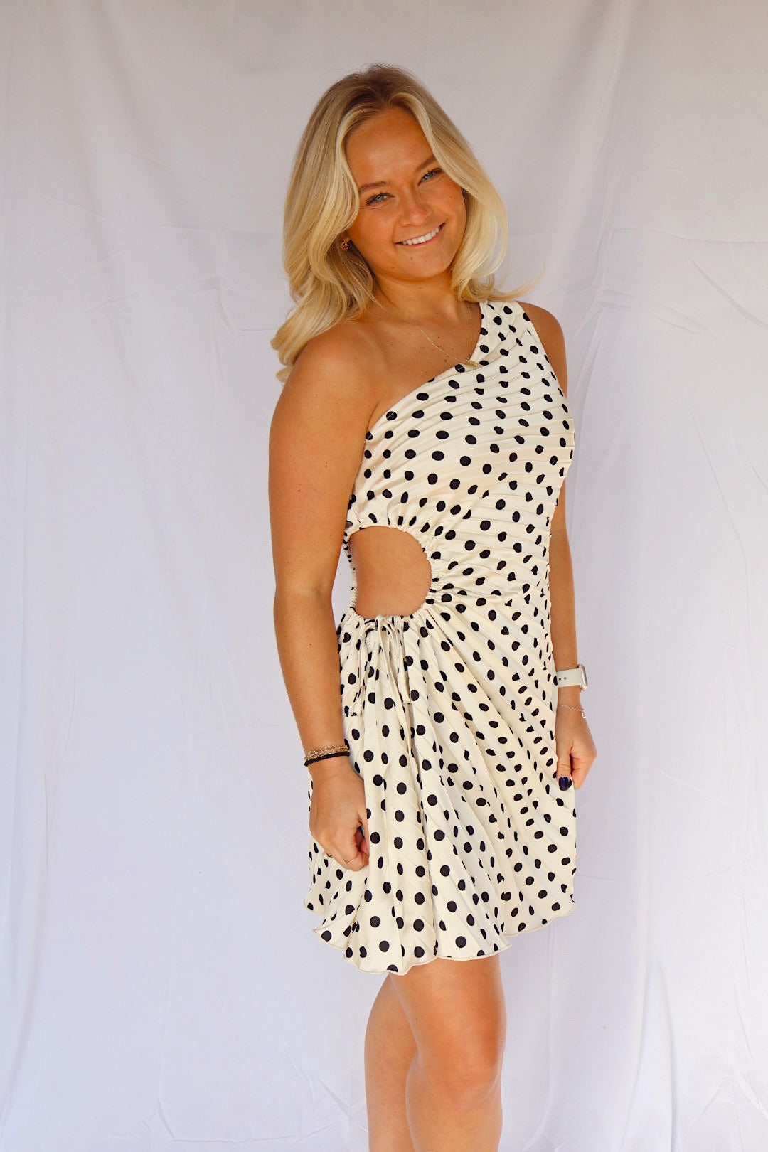 Such a cute style! This polka dot dress features a waist cutout with drawstring detail as well as one shoulder. The material is fabulous. Get ready for the compliments in this one!