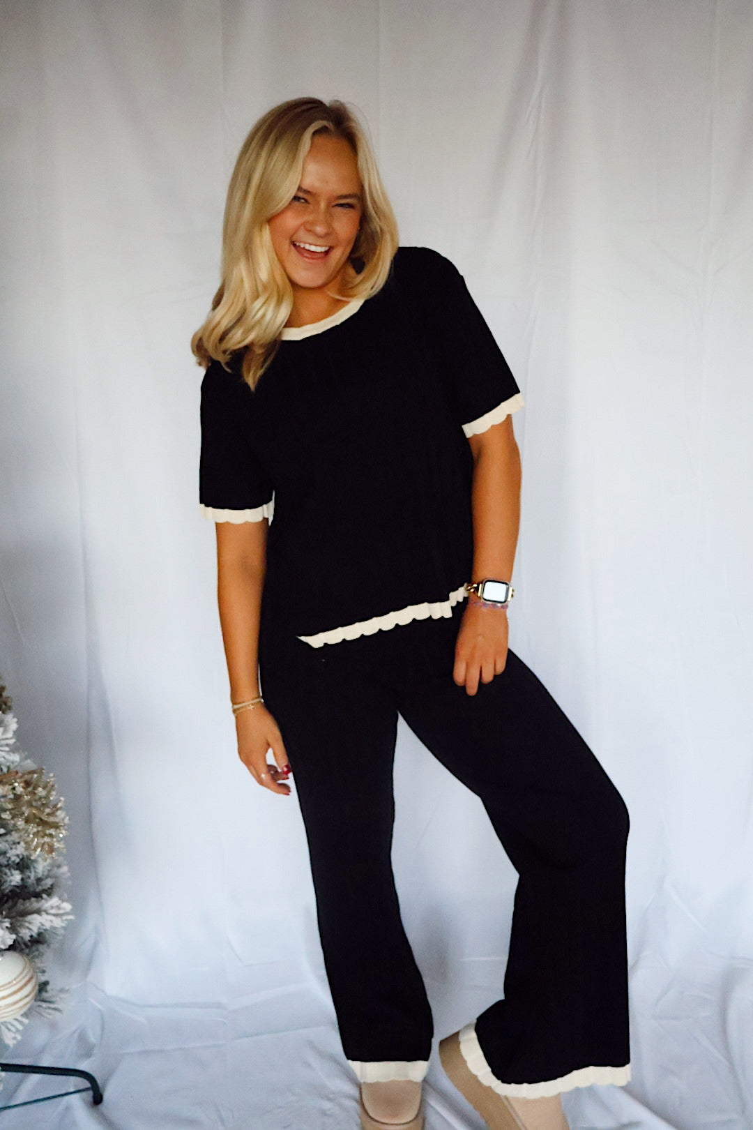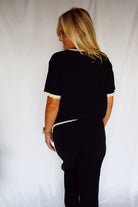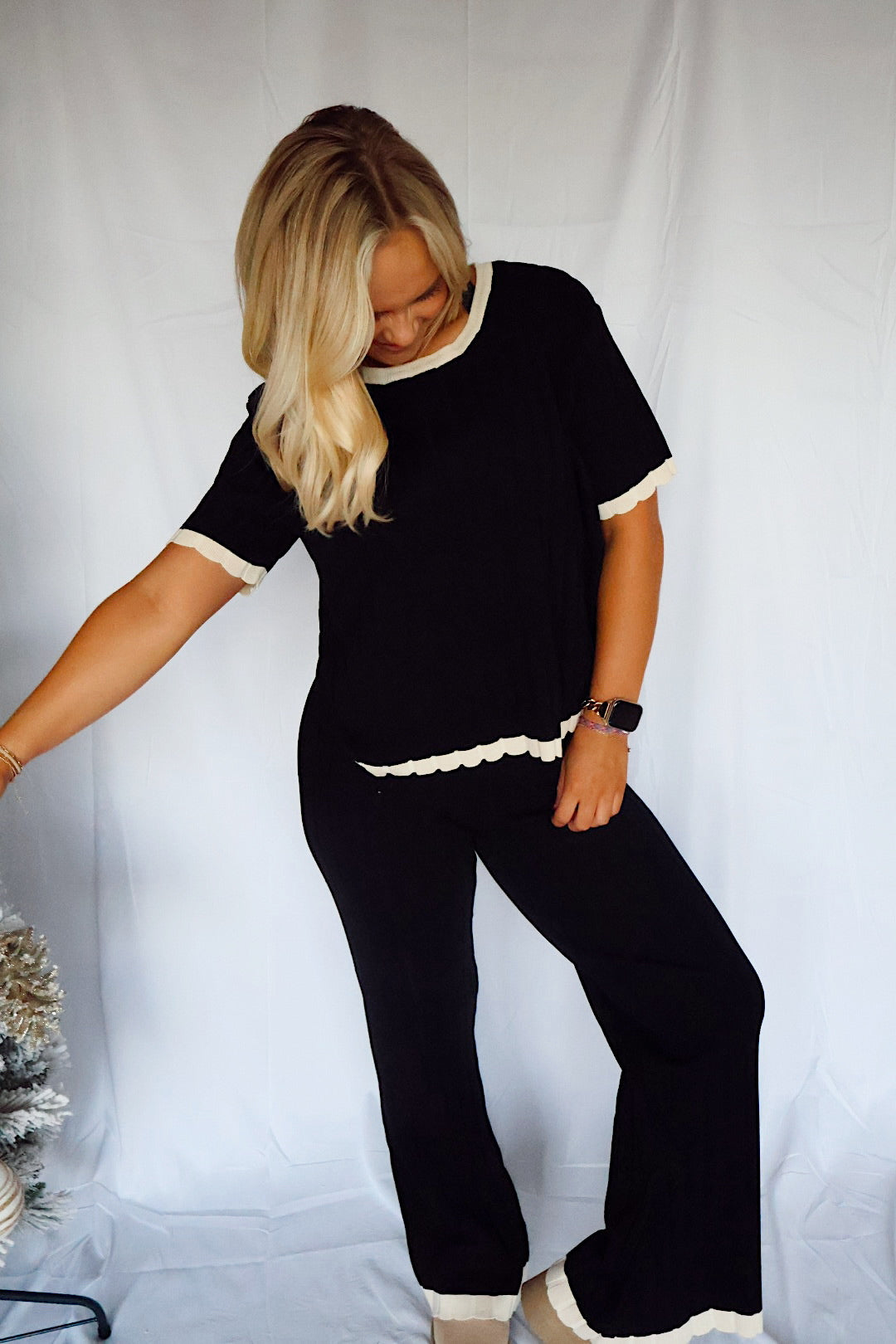 Our black with cream trim lounge set is to die for! Seriously we could wear this everyday for the rest of our lives!
