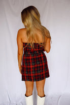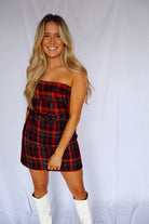 We are in love with our red and black plaid tweed strapless dress. With some gold detail and a pop of sequins, this dress might be just for you!