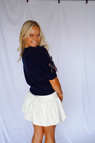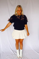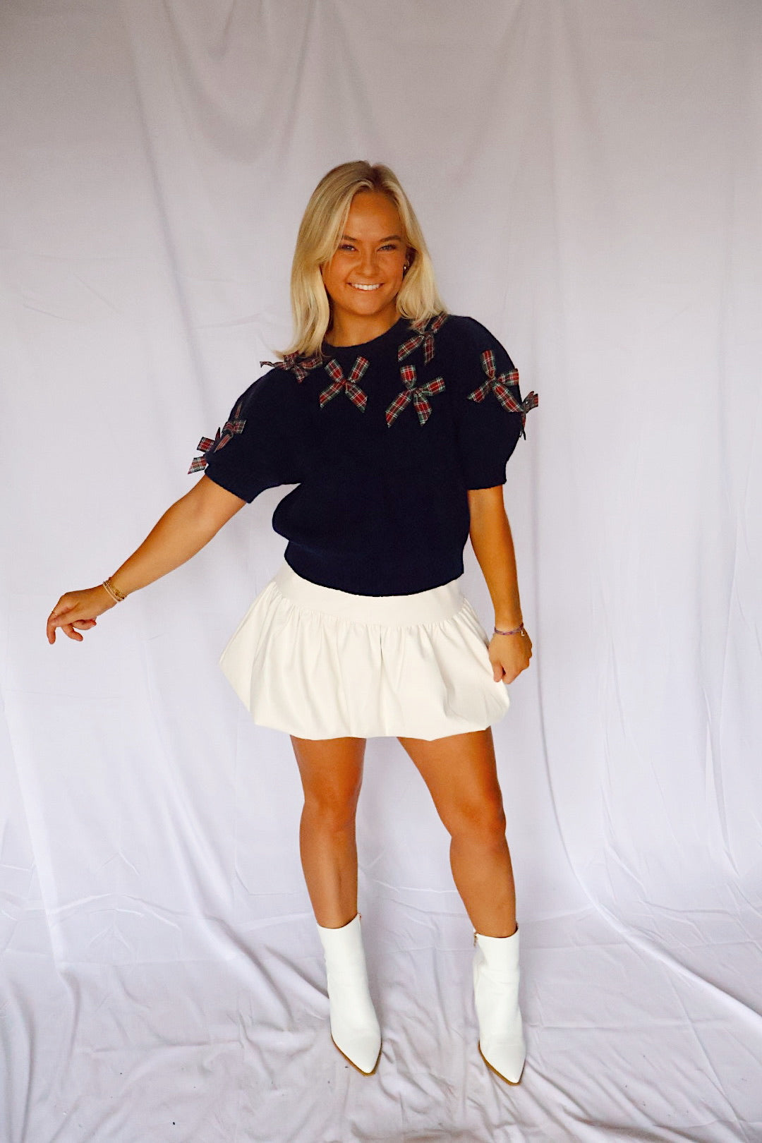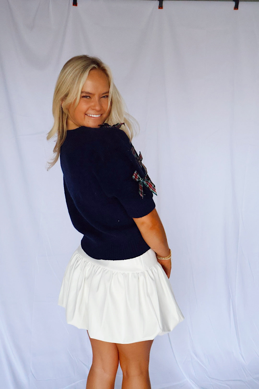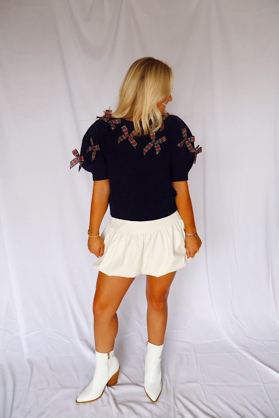 A super cute option for the holiday season is our navy sweater topped with plaid satin bow detail. Would look perfect paired with our faux leather puffer mini skirt. And did we mention how comfy this top is!! A holiday must have!