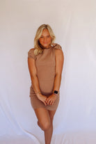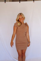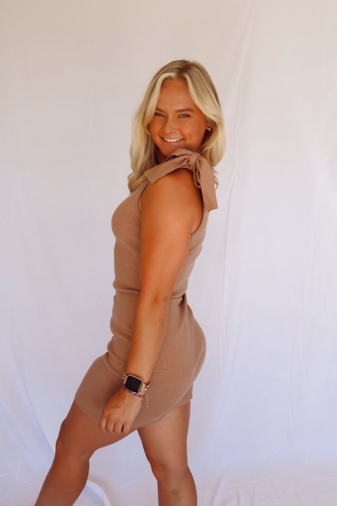 Our asymmetrical shoulder sweater dress is perfect! The shoulder bow adds some personality and we love it!