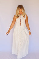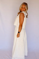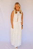 A stunning eyelet lace blouse and skirt set! Worn together or separately. The adorable blouse features three tie closures with scalloped edging around the collar and waist. Skirt has a ruffled elastic waist.
