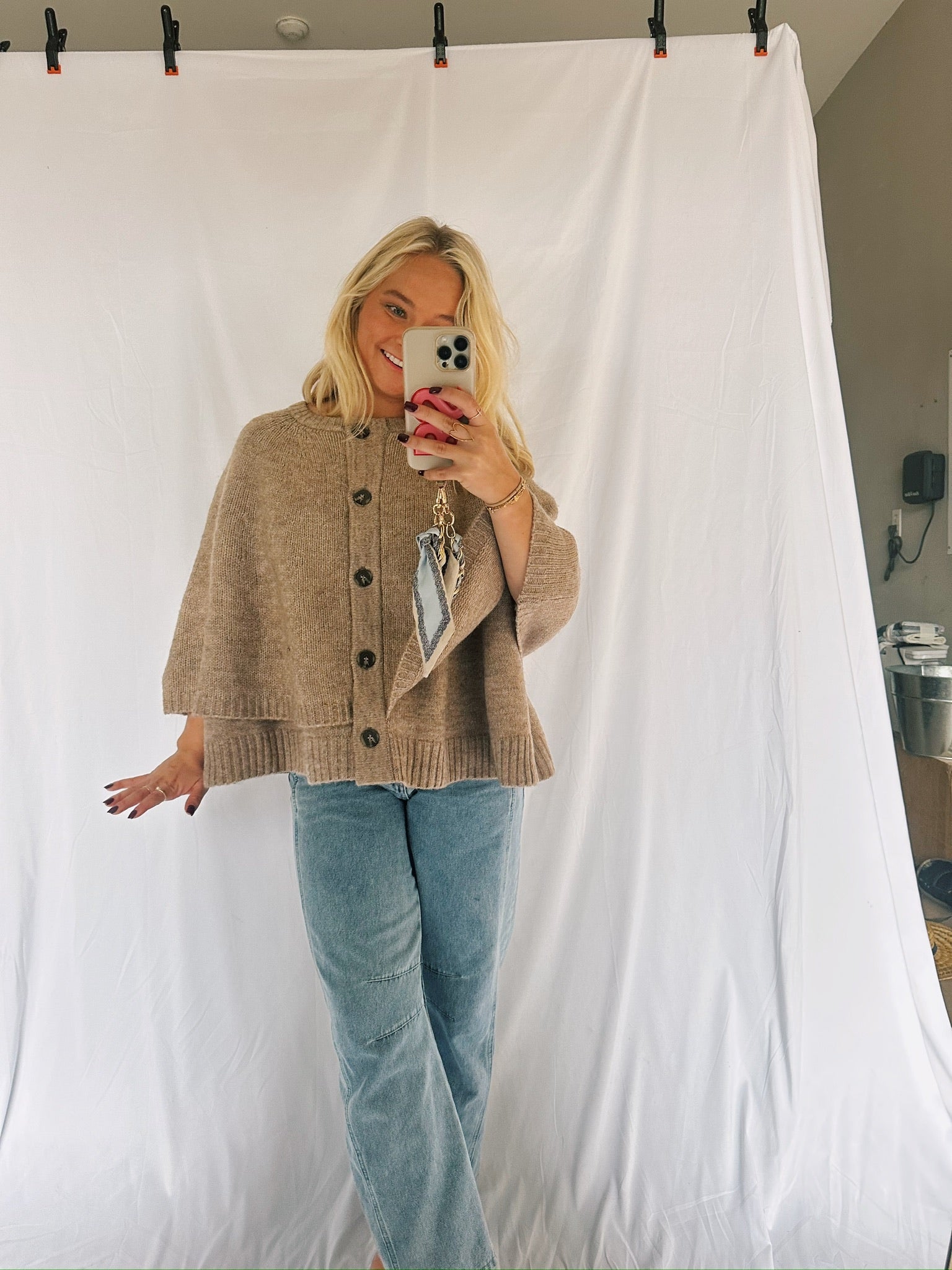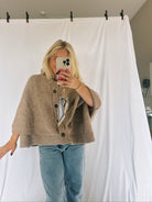 Our button up sweater cape is a perfect throw over! So comfy and oversized! A must have for this season!