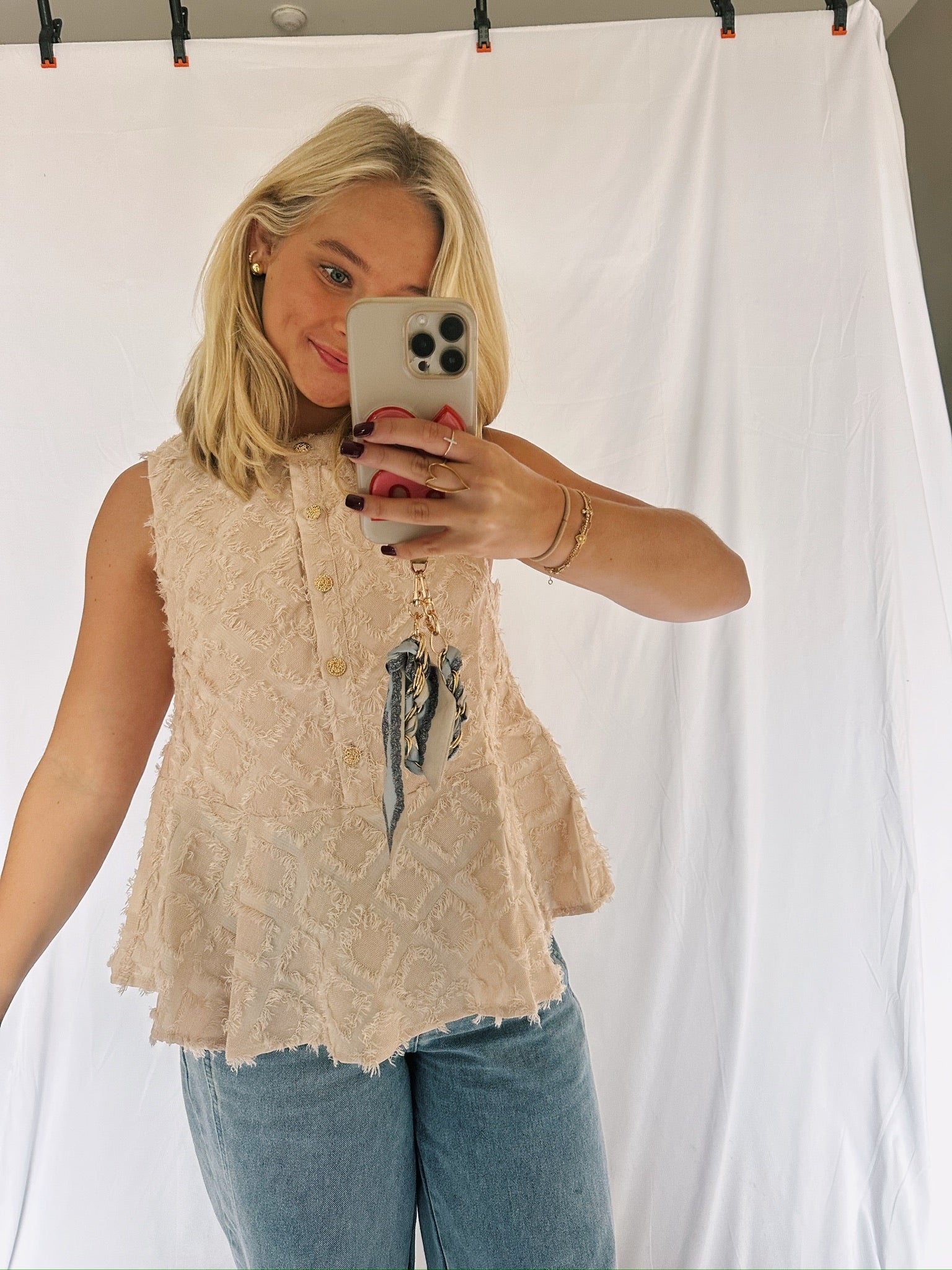 Our ivory detailed pattern top is screaming thanksgiving! We are obsessed with the details and gold buttons!