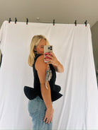 This top is the perfect dress up top! We are obsessed with the ruffle flare at the bottom!