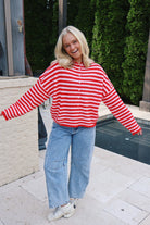 Our stripes on stripes sweater has always been a best seller, so we brought it back in pink and red! the most comfortable sweater that can be styled in so many different ways!