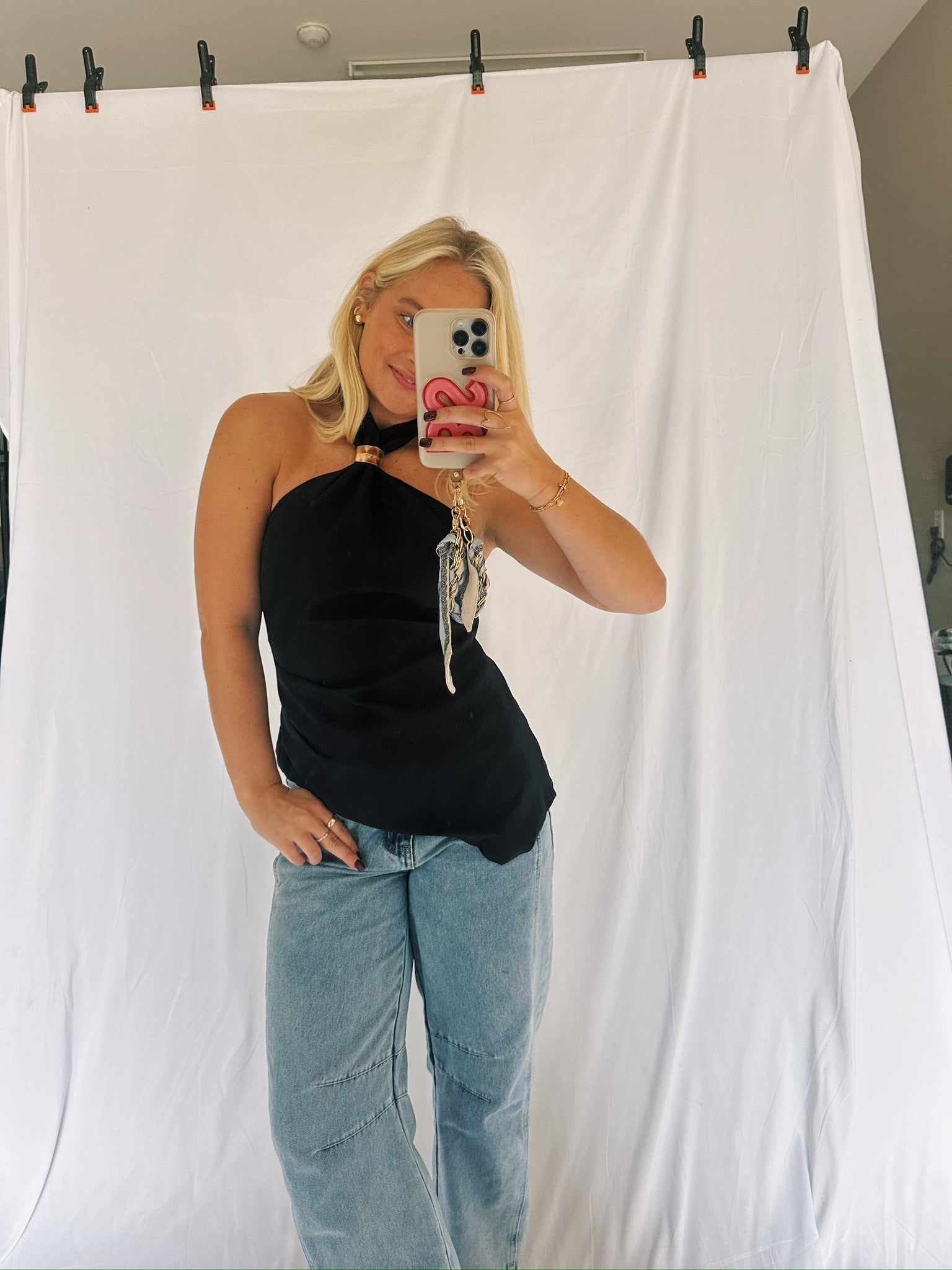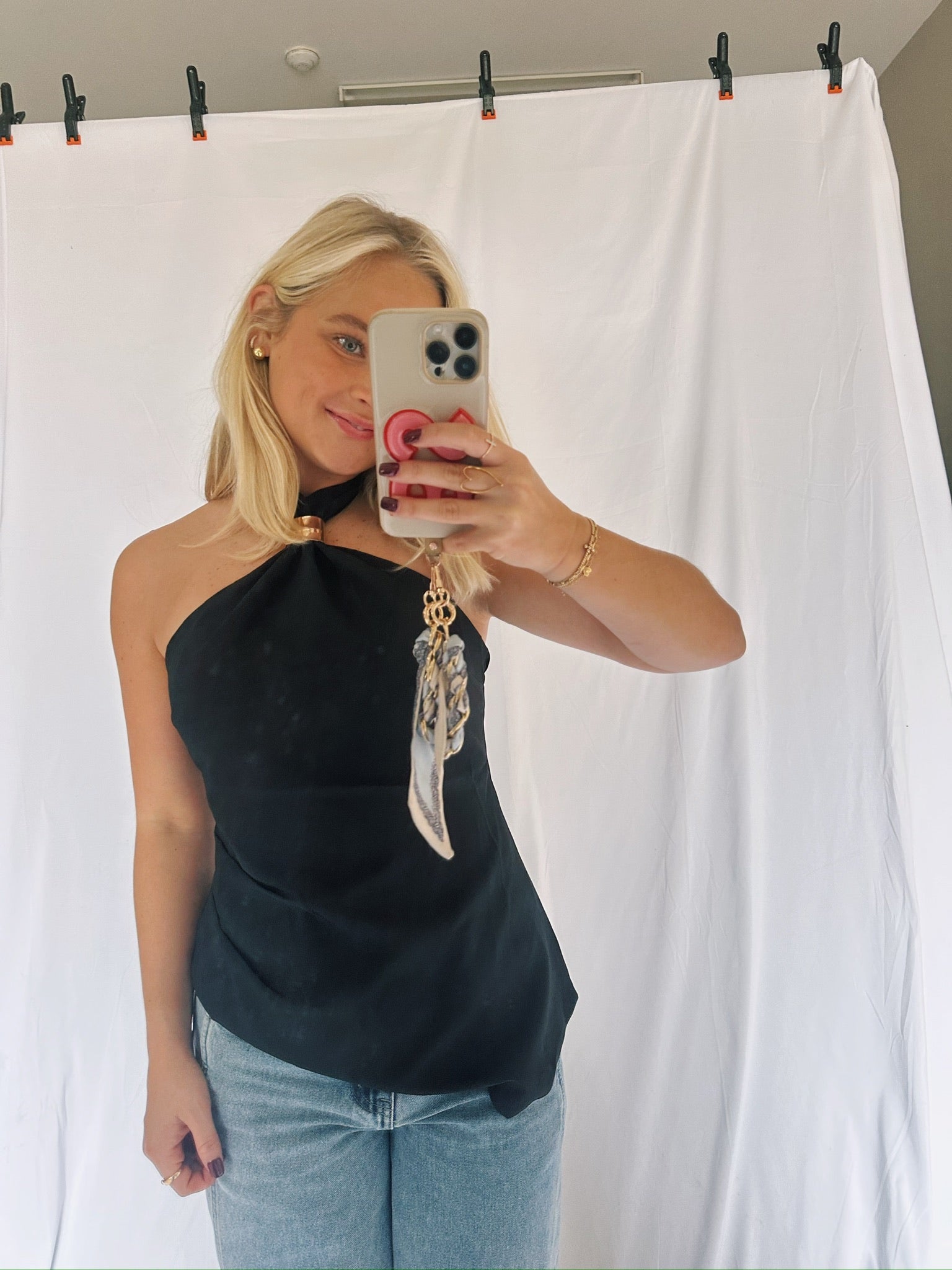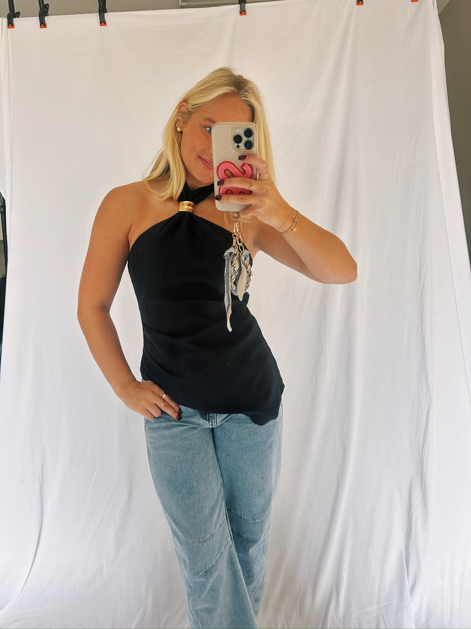 Asymmetrical Black Halter, Gold Ball Top