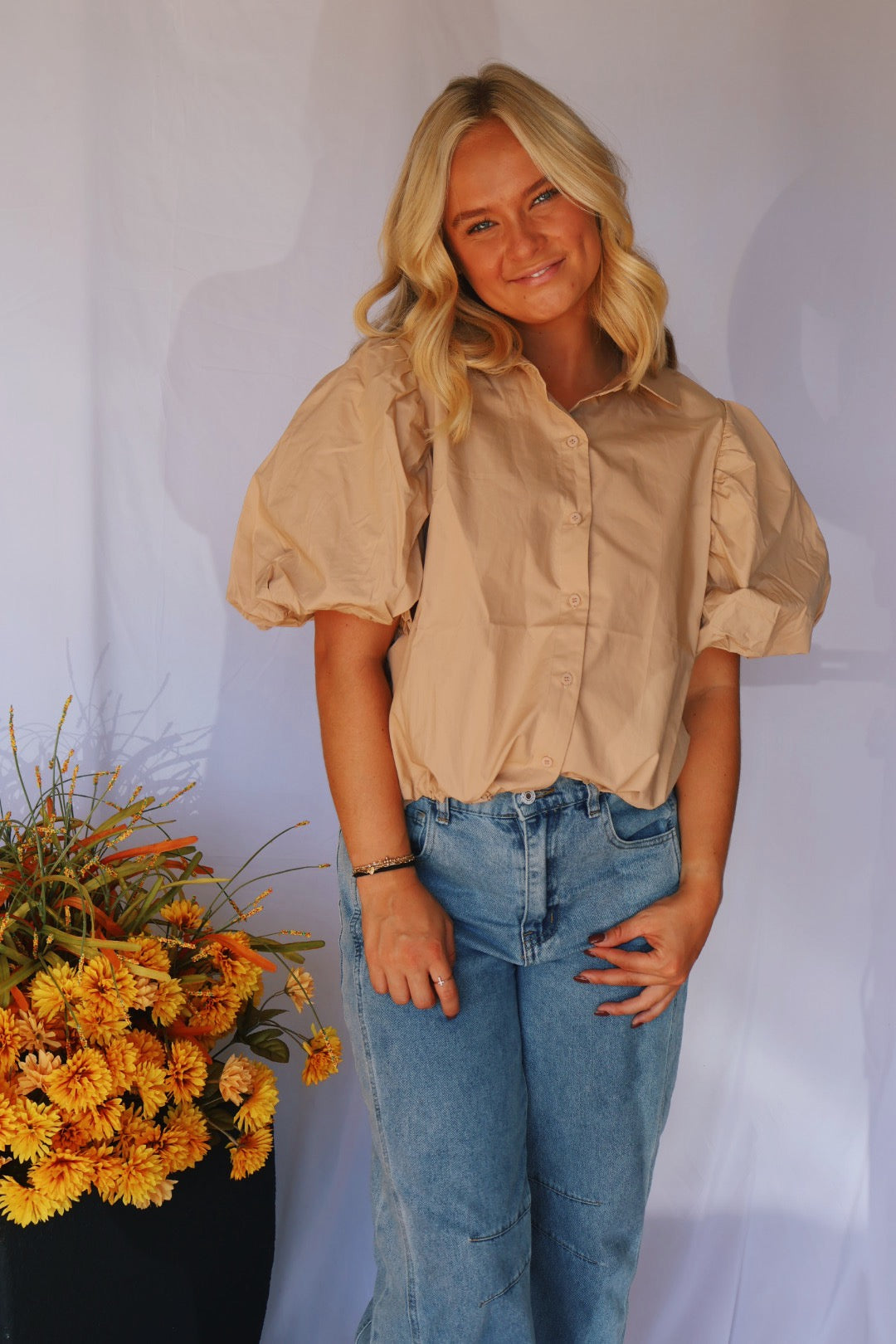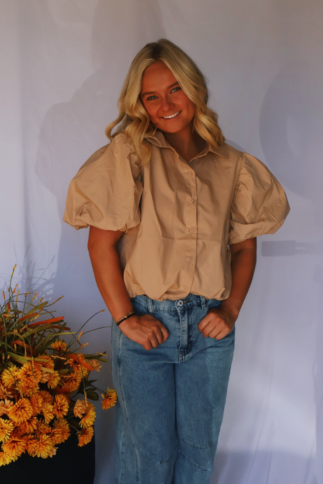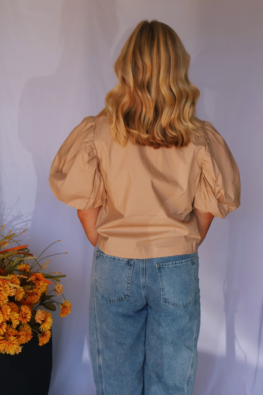 Tan Puffer Sleeve Top